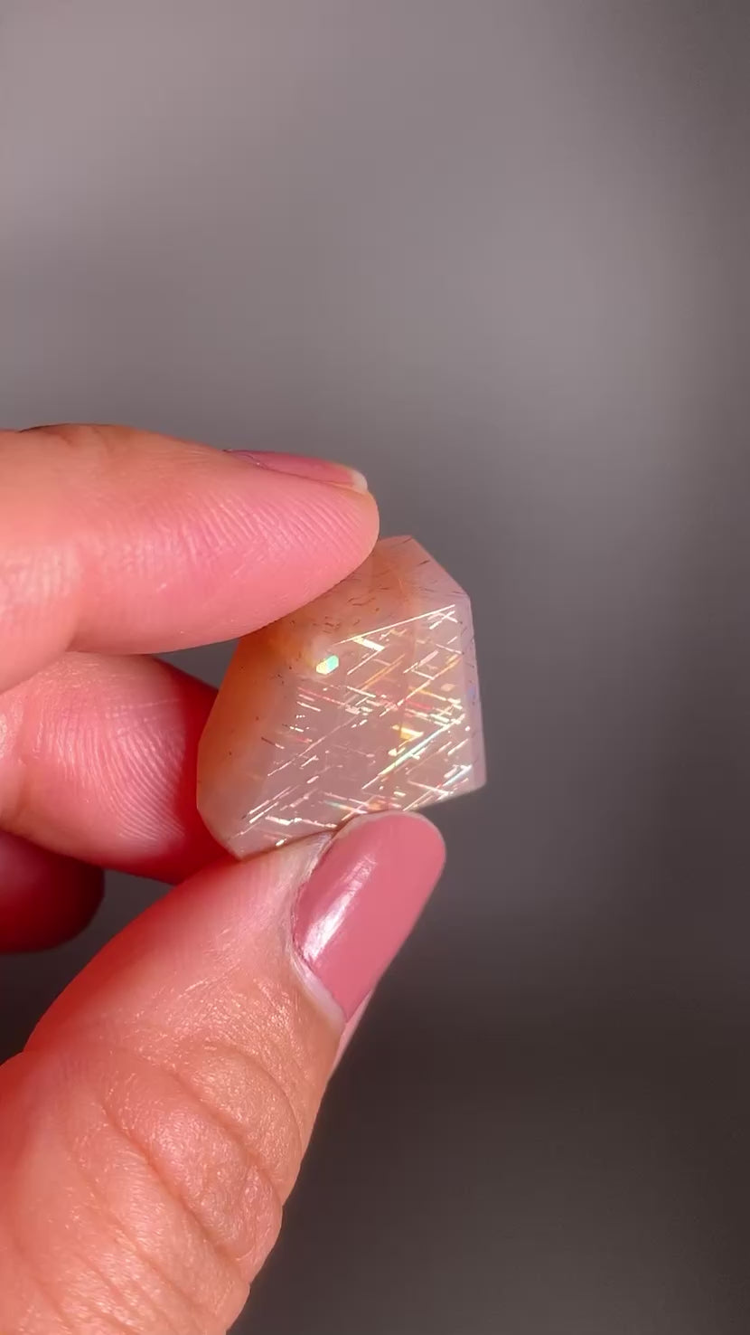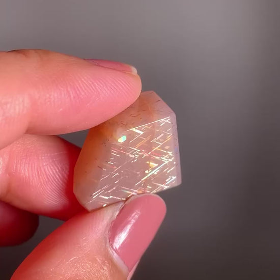 Rainbow Lattice Sunstone from Tanzania is a rare gem with sparkling lattice patterns and flashes of rainbow color — a natural stunner that’s totally unique.