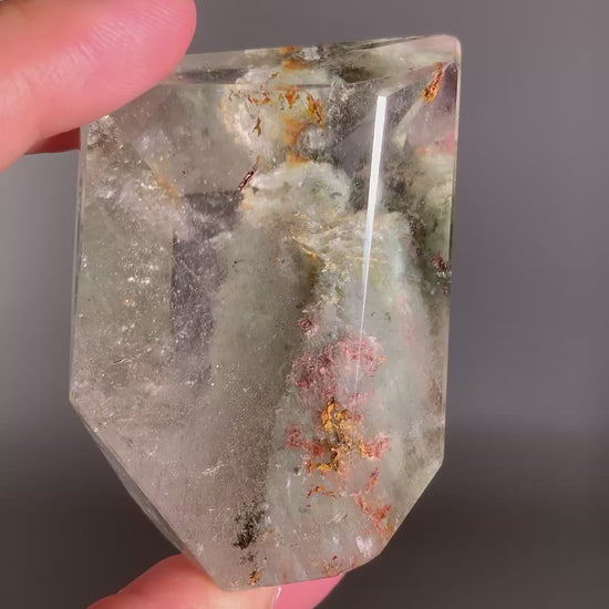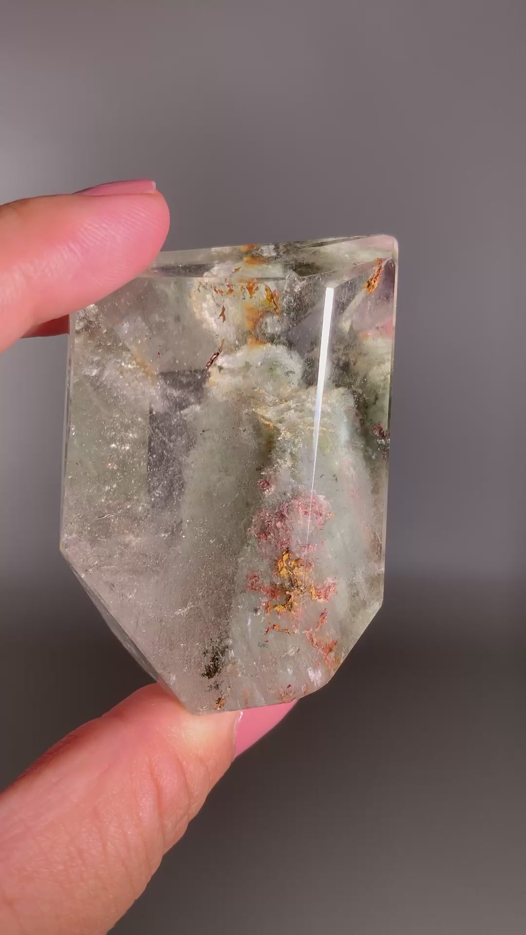 This polished Garden Quartz freeform from Zambia captures a serene "raining forest" scene, with misty green and pink inclusions that resemble gentle rain falling through a lush landscape. A tranquil and visually striking piece.