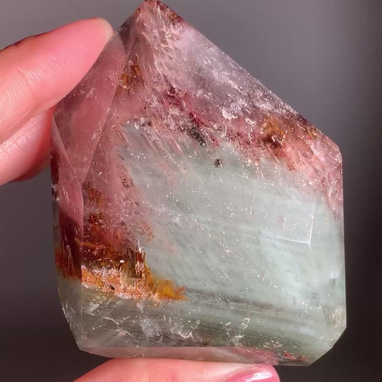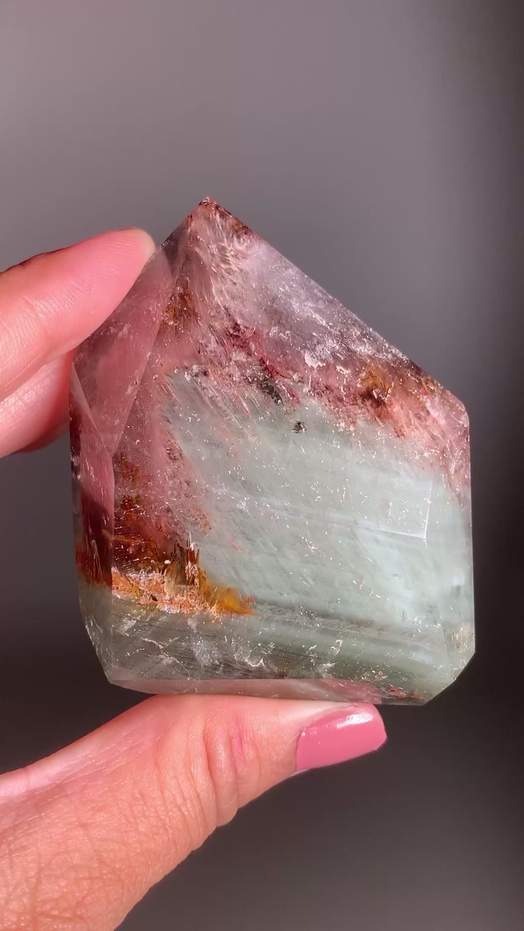 This rare polished tower combines the vibrant, layered inclusions of Garden Quartz with the soft, ethereal beauty of Pink Amphibole. The result is a breathtaking crystal full of depth, color, and unique character—highly prized by collectors for both its rarity and natural artistry.