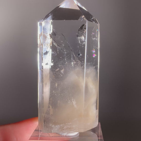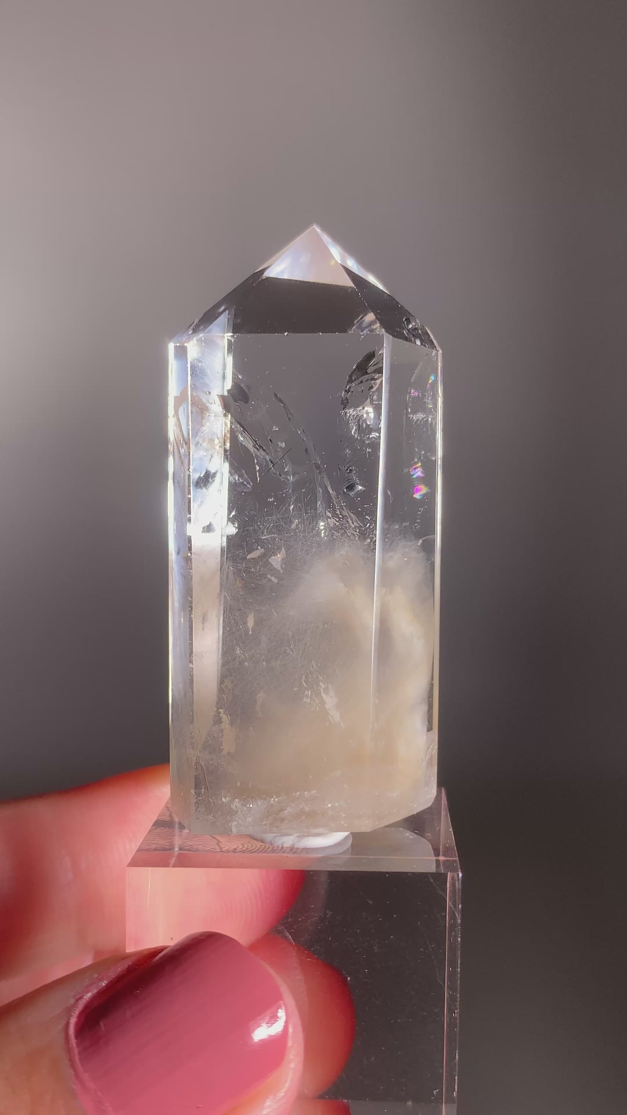 This Rare Cream Amphibole Polished Tower from Brazil reveals soft, creamy amphibole within clear quartz, creating a gentle and elegant depth. Expertly polished to showcase its natural beauty, this serene collector’s crystalembodies harmony and refined energy.