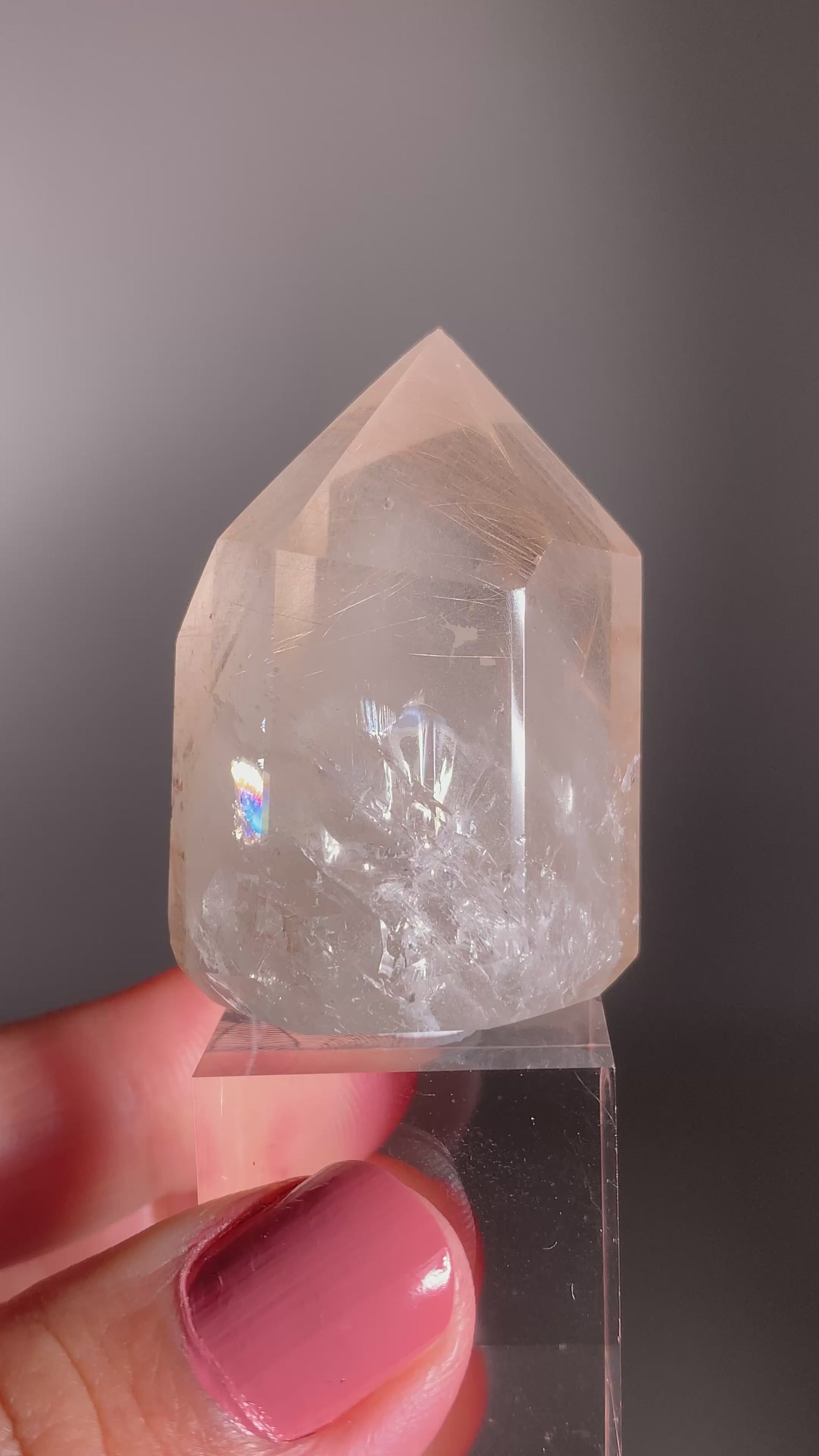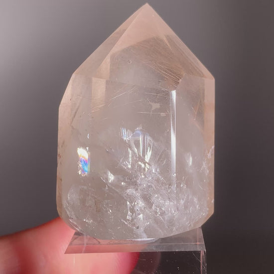 This Rare Cream Phantom Polished Tower from Brazil features elegant cream-toned phantom layers highlighted by shimmering champagne rutile and anatase inclusions. Beautifully polished to enhance its depth and luster, this exquisite collector’s crystal radiates sophistication and serene energy.