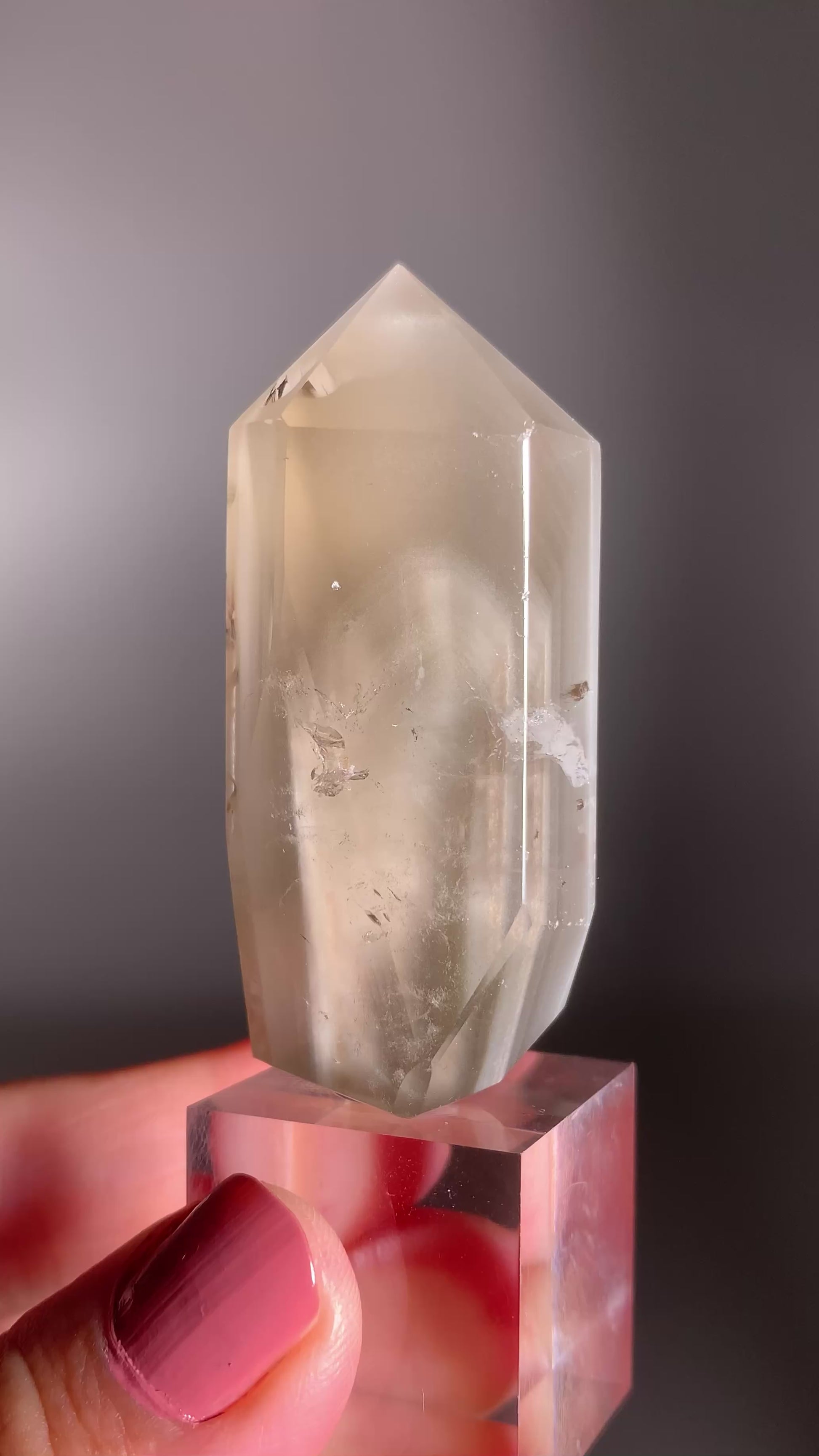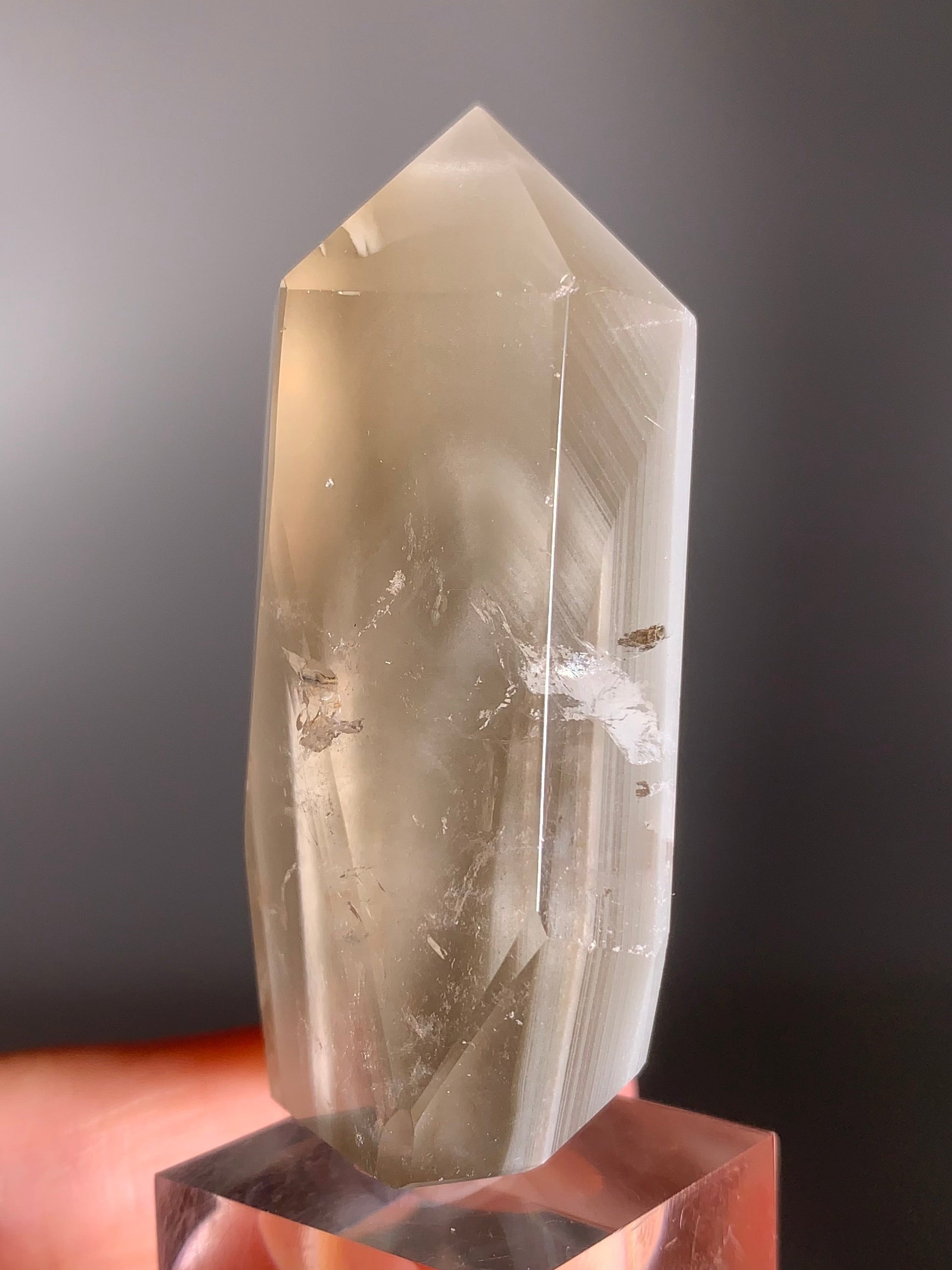 This Rare Cream Phantom with Champagne Rutile Polished Tower from Brazil showcases soft cream phantom layers paired with shimmering champagne-gold rutile threads. Expertly polished to highlight its inner glow and natural beauty, this elegant collector’s crystal radiates calm, clarity, and refined energy—an exquisite piece for any crystal lover or display.