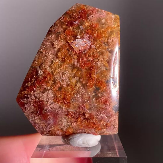 This rare variety of rutilated quartz features delicate, flower-like rutile formations in shades of red copper, gold, and pink, densely packed within clear quartz. Polished into a smooth freeform shape, each piece highlights nature’s intricate artistry.