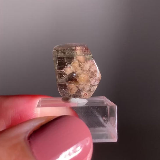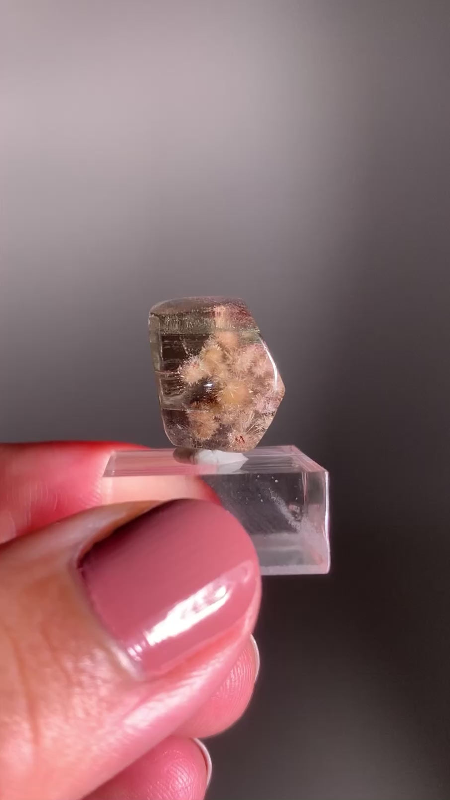 This rare polished freeform quartz showcases radiant gold flower rutile paired with layered green phantom formations and soft purple garden inclusions. The stunning combination creates a rich, multidimensional scene within the crystal—like a hidden forest touched by light. A unique and vibrant piece, perfect for display or energy work.
