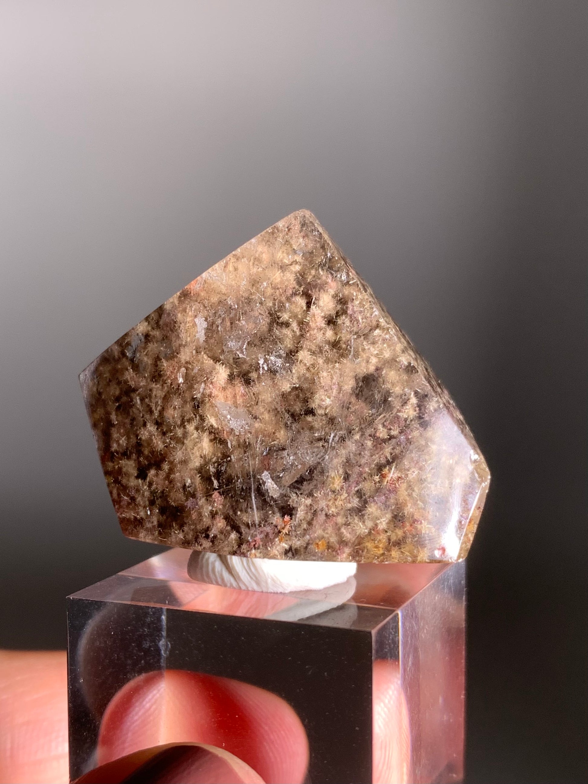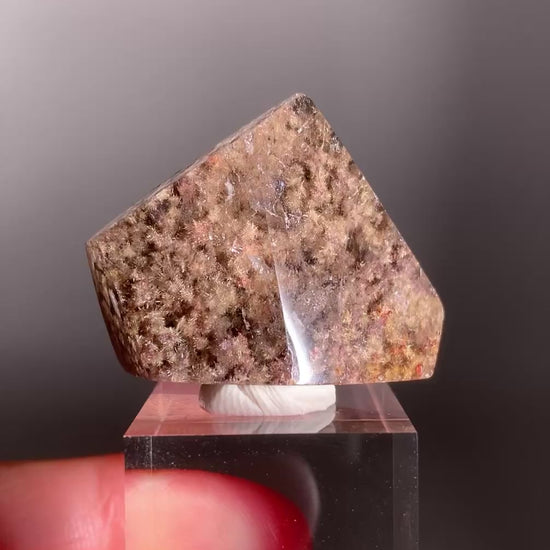 This rare polished freeform features densely packed gold and light gold flower rutile with purple lodolite, all captured within clear quartz. A striking and unique piece full of natural beauty and detail.