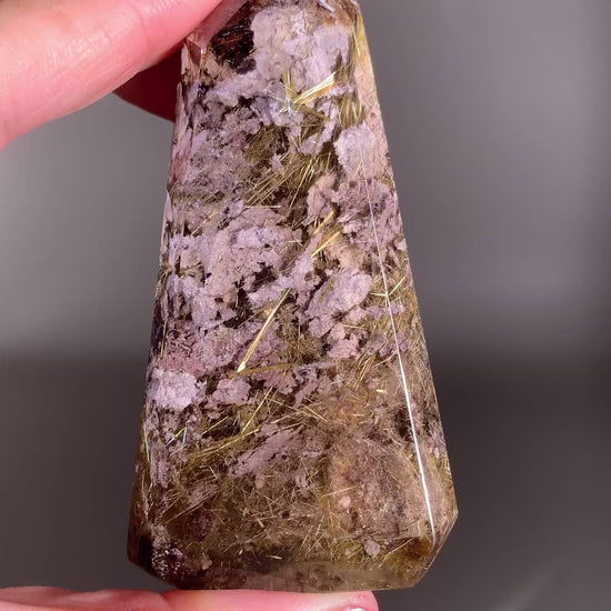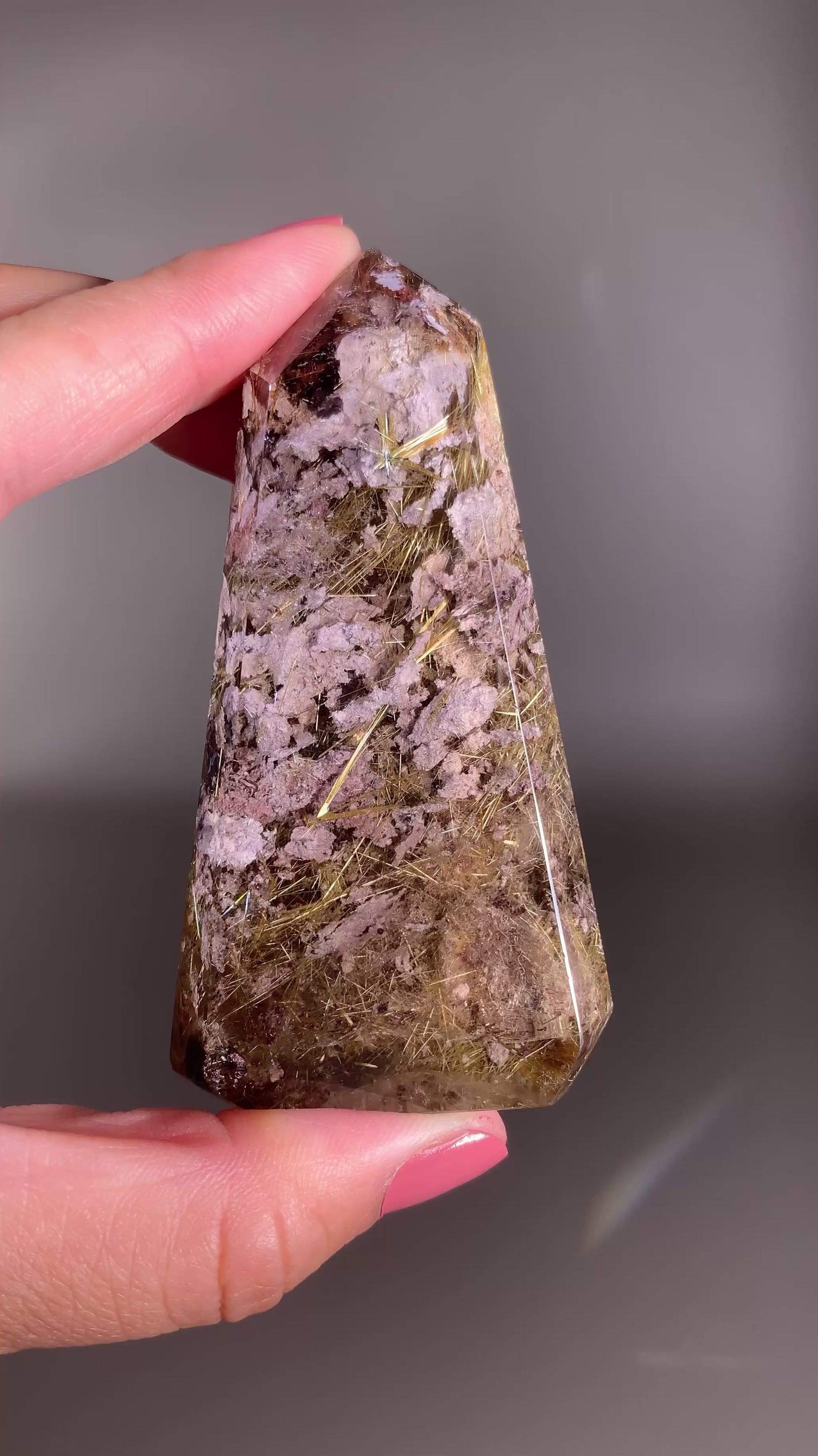 A rare polished tower from Brazil featuring dazzling gold star rutile needles intertwined with vibrant purple garden quartz. This striking collector’s piece showcases natural beauty and unique crystal formations.
