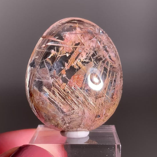 This stunning polished piece features intricate lattice silver rutile needles intertwined with sparkling hematite, mica and garden quartz inclusions. Hand-polished to showcase its natural patterns and depth, this ethically sourced piece from Brazil is truly one-of-a-kind.