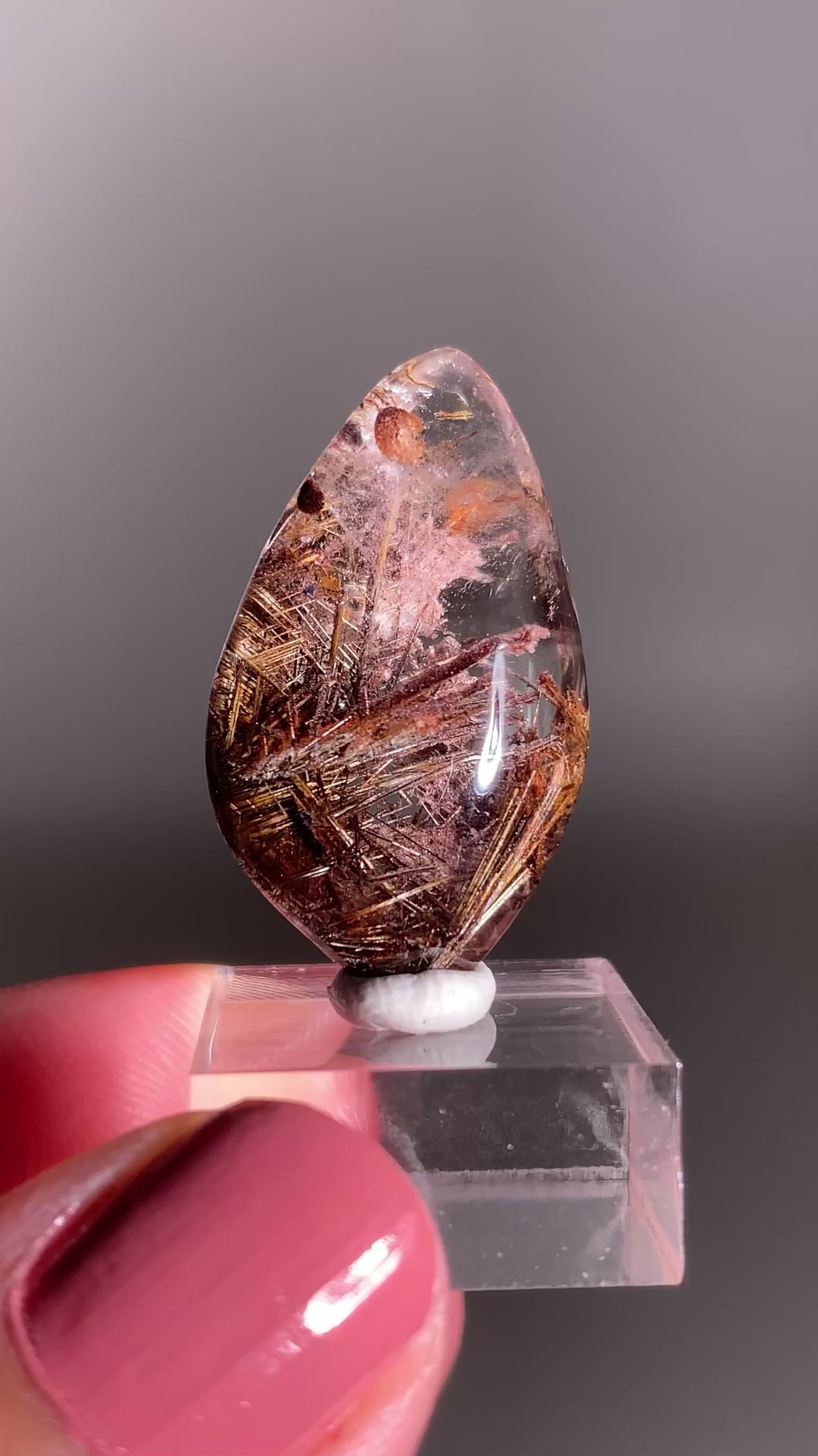 This stunning polished freeform features intricate lattice rutile needles intertwined with sparkling Hematite, mica and pink garden quartz inclusions. Hand-polished to showcase its natural patterns and depth, this ethically sourced piece from Brazil is truly one-of-a-kind.
