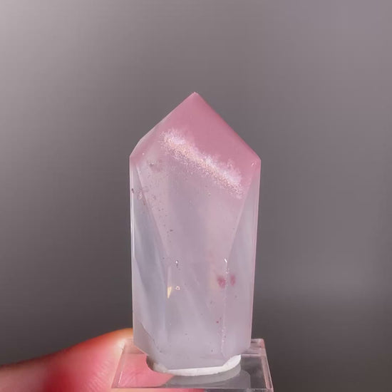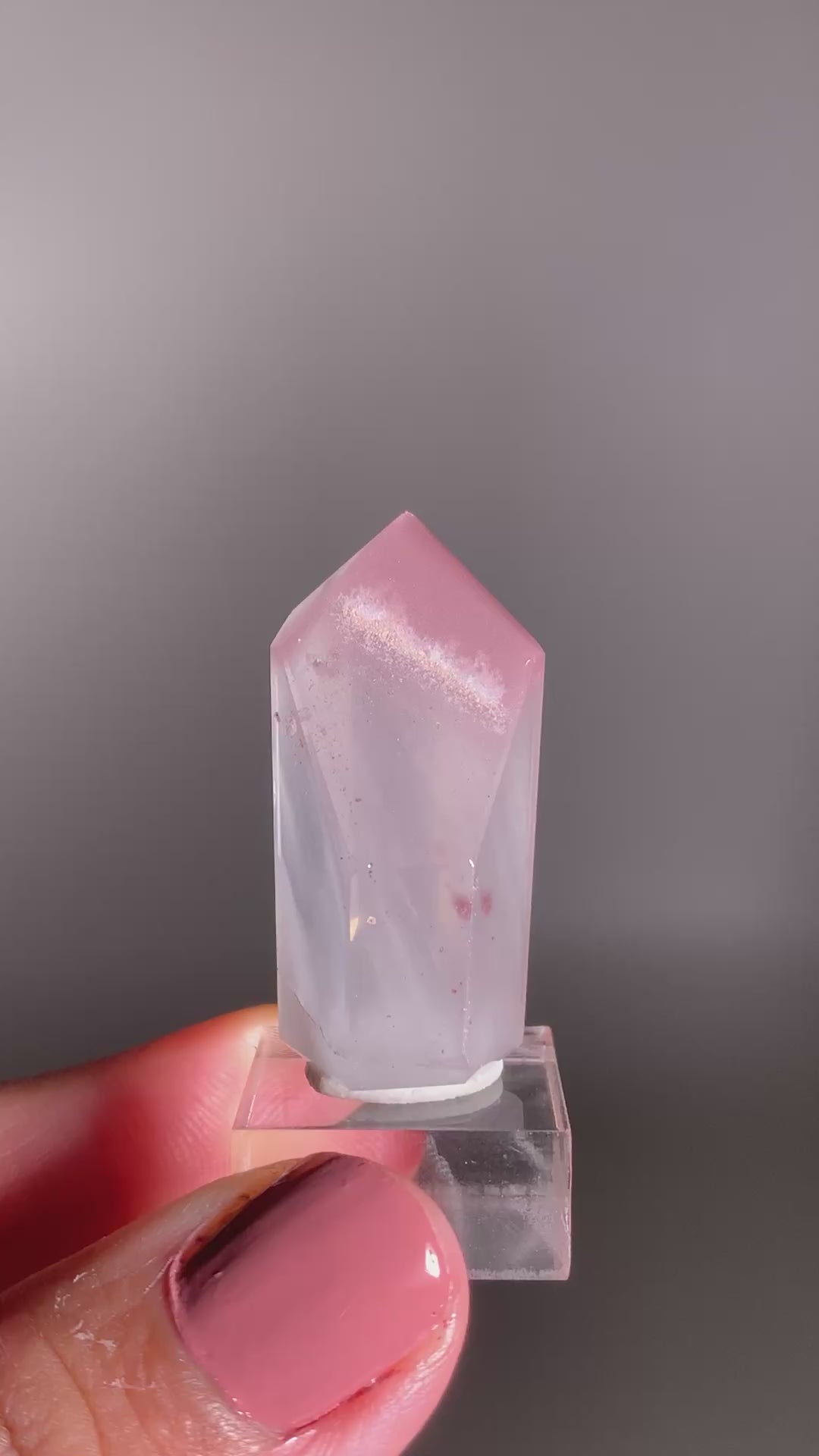 A rare Pink Lithium tower from Brazil featuring elegant white Amphibole inclusions. This unique combination showcases soft blush tones with ethereal white patterns, making it a prized collector’s specimen.