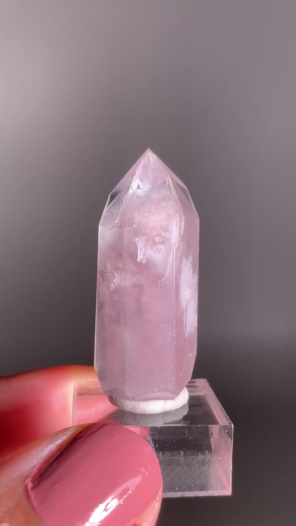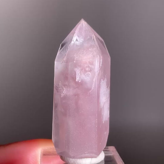 A rare Pink Lithium tower from Brazil featuring elegant white Amphibole inclusions. This unique combination showcases soft blush tones with ethereal white patterns, making it a prized collector’s specimen.