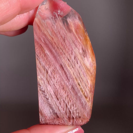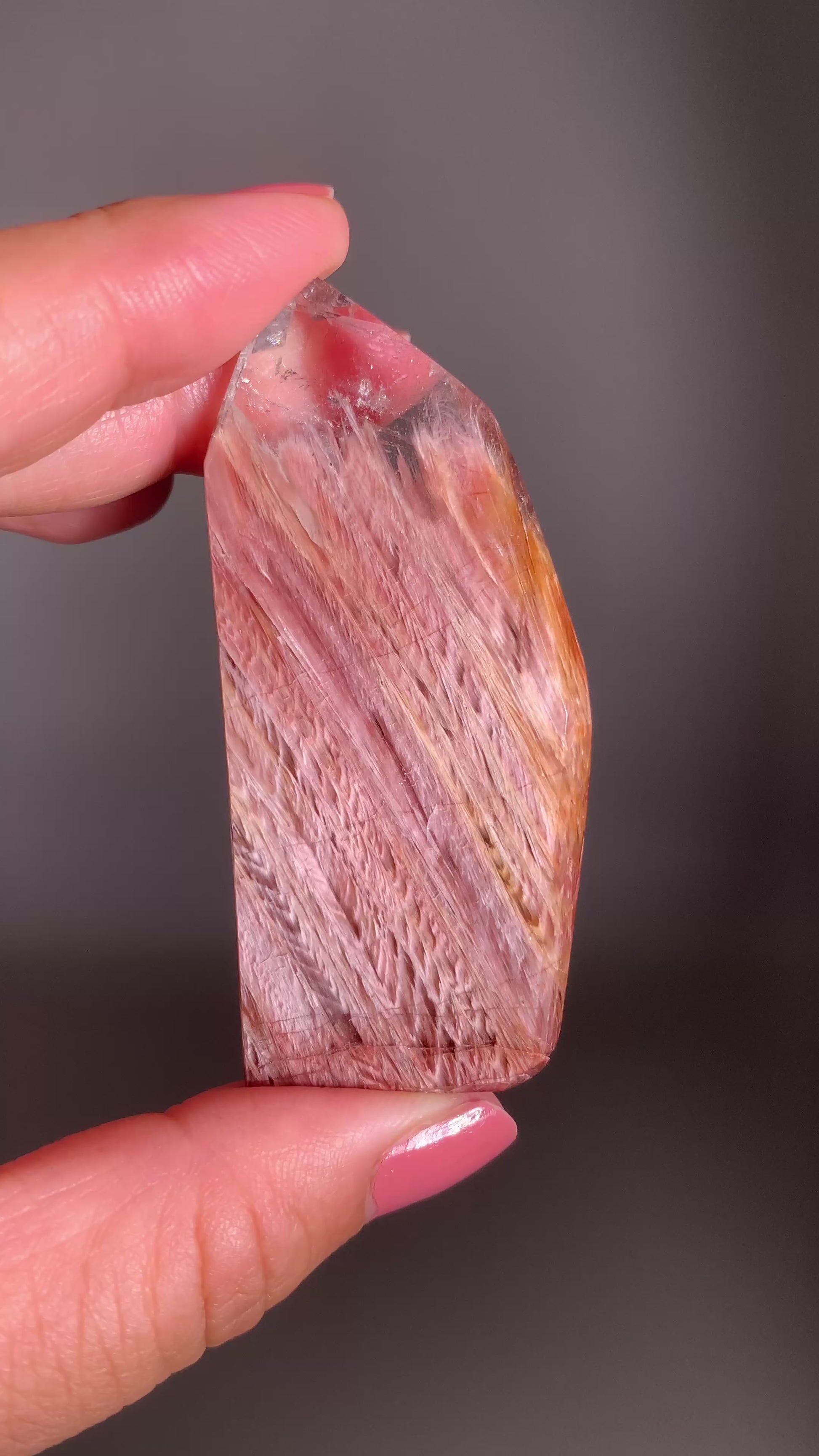 This Rare Shiny Pink Amphibole Quartz Tower from Brazil glows with delicate pink tones and silky inner textures. The polished surface enhances its natural luster, revealing dreamy, cloud-like inclusions within. A radiant collector’s crystal that embodies beauty, peace, and gentle energy.