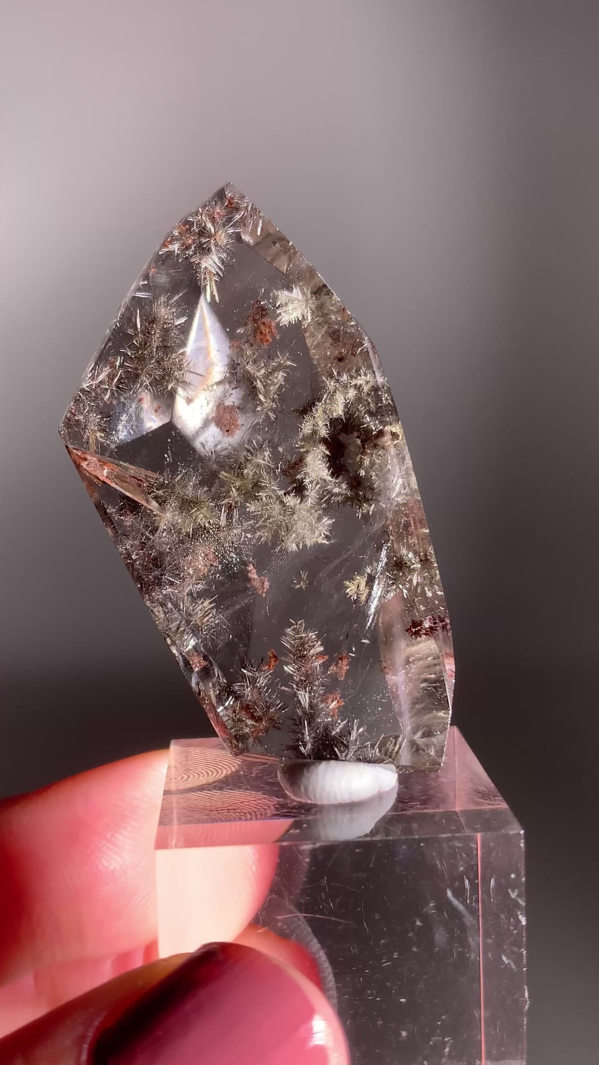This Rare Silver Flower Rutile Polished Freeform from Brazil showcases delicate, radiant silver rutile formations that bloom like tiny flowers within clear quartz. The polished surface enhances their natural shimmer and intricate beauty, making this a truly unique collector’s crystal full of elegance and luminous energy.