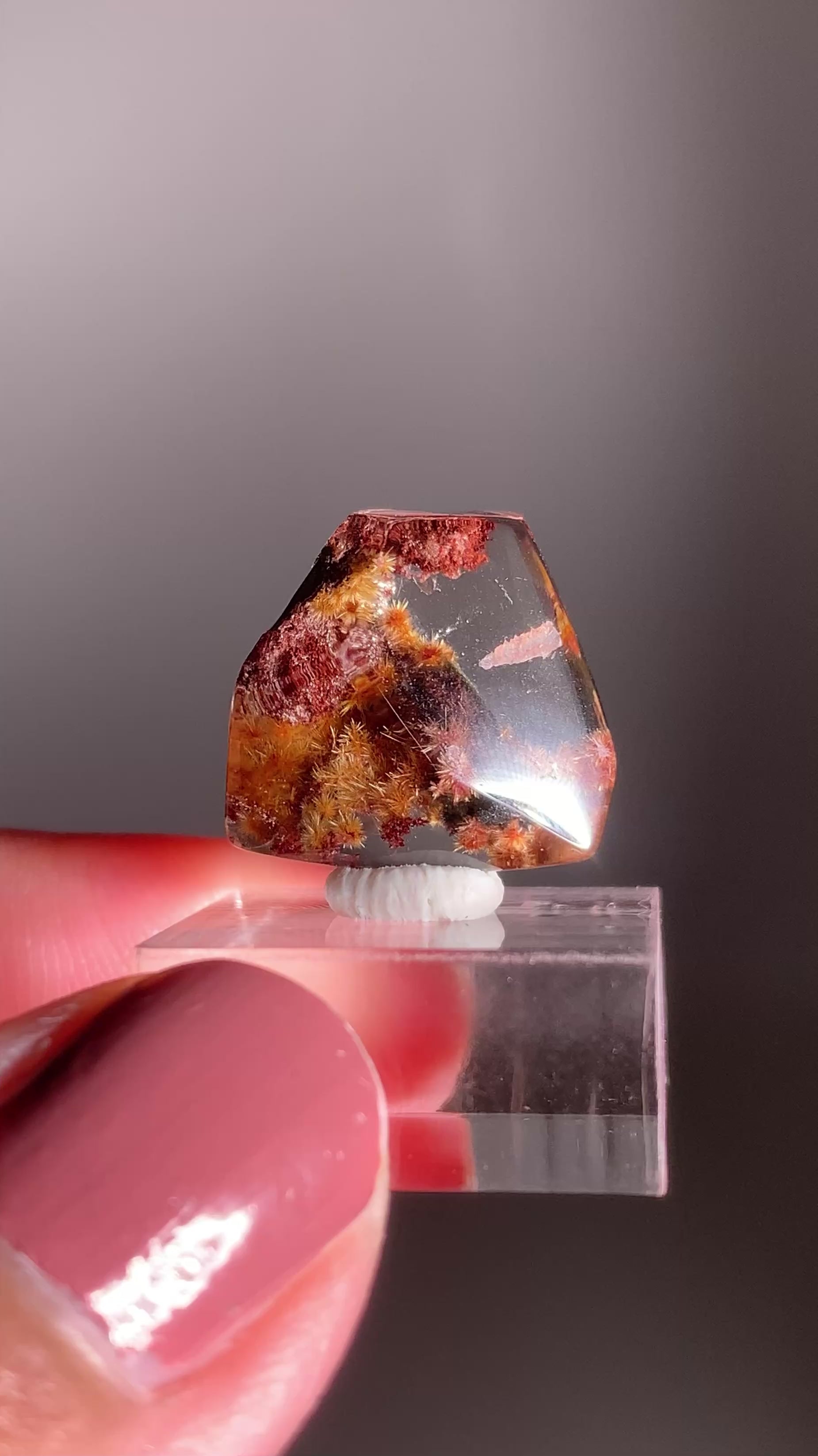 A rare mini gem from Brazil featuring starburst and fireworks-like rutile patterns in shades of gold, copper, and silver. These shimmering inclusions create a dazzling display, making it a unique and highly collectible crystal.
