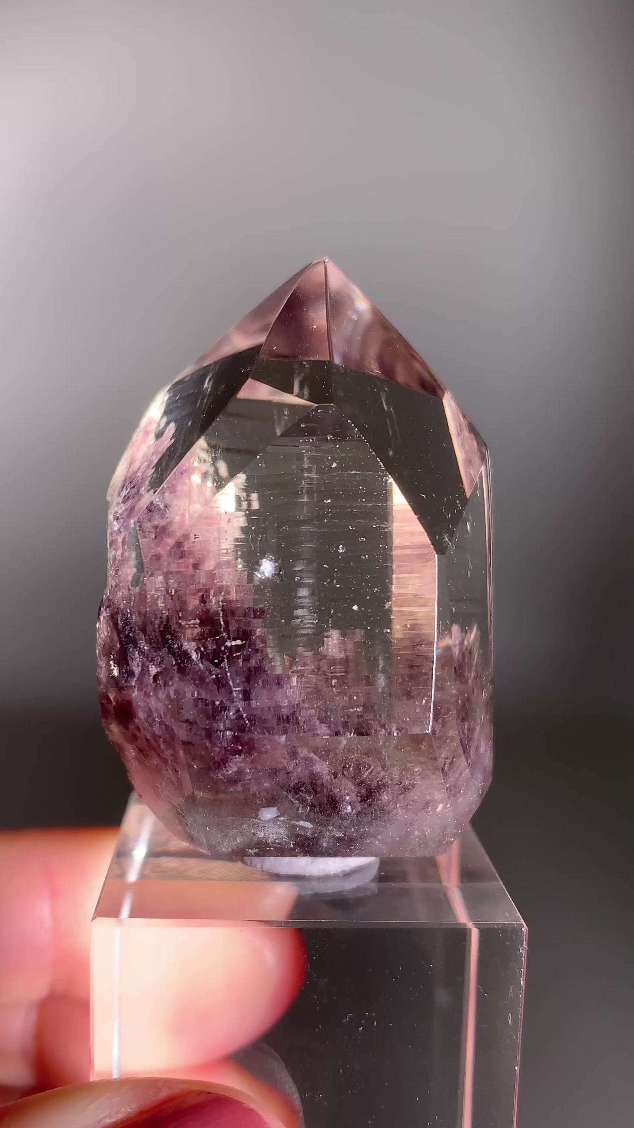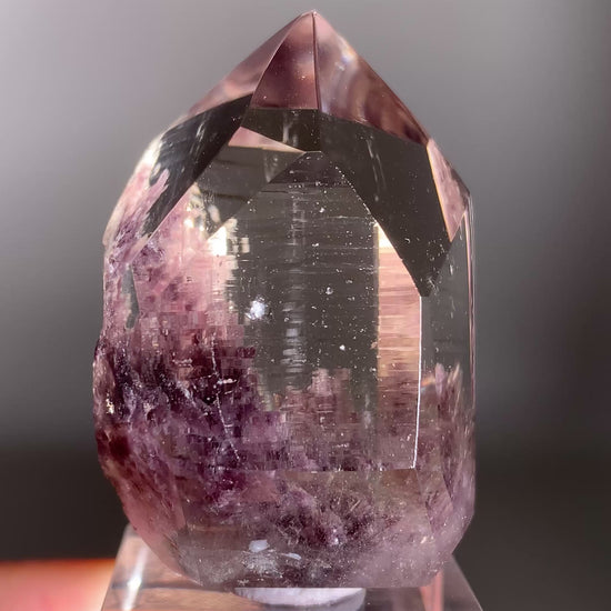 Rare top-grade Lepidolite in Quartz point tower from Madagascar, featuring semi-polished faces that leave part of the natural point exposed with beautiful crystal striations. A unique collector mineral with stunning natural textures.