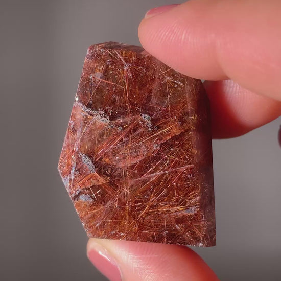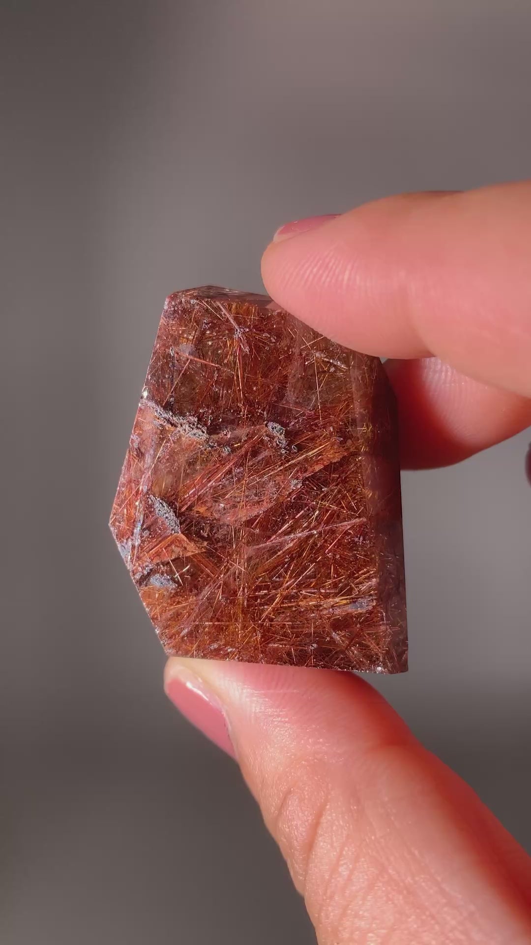 A stunning polished freeform featuring intertwined red copper and gold rutile strands — a rich and radiant display of natural beauty and mineral brilliance.