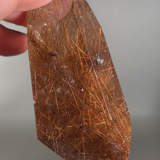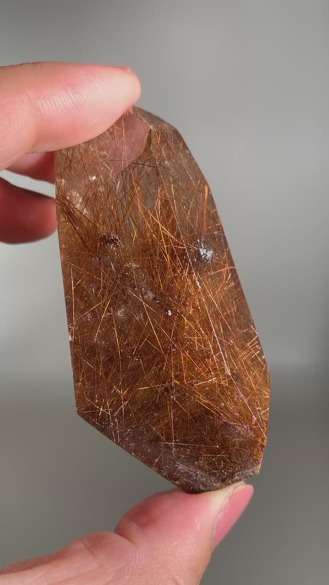 A richly packed polished freeform of smoky quartz filled with dense, shimmering copper rutile inclusions. The deep, smoky body contrasts beautifully with the metallic rutile threads, creating a bold and fiery display of natural brilliance. This piece is an exceptional example of rutile saturation and mineral intensity.