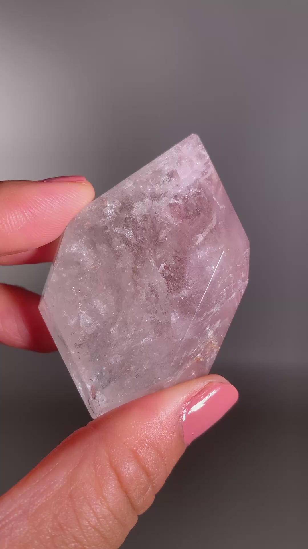 A polished Garden Quartz freeform from Brazil, featuring soft pink lithium and layered pink, mauve garden inclusions that create a serene, dreamlike landscape within clear quartz.
