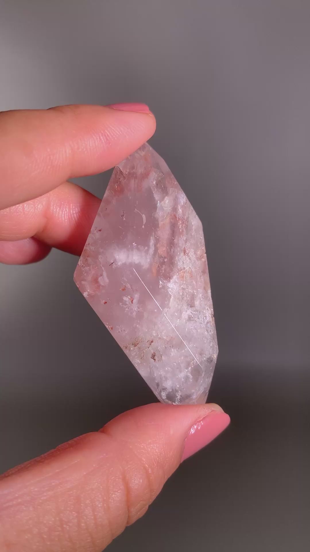 A polished Garden Quartz freeform from Brazil, featuring soft pink lithium and layered pink, mauve garden inclusions that create a serene, dreamlike landscape within clear quartz.