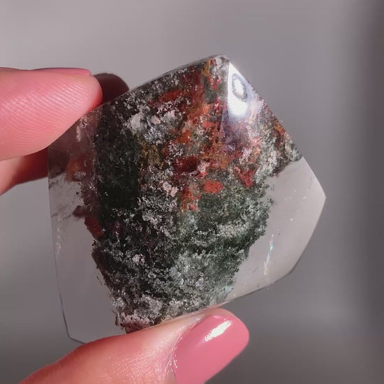 A scenic Garden Quartz polished freeform from Brazil, featuring dreamy pink, red, yellow and green mineral inclusions with soft frosted textures that resemble a miniature natural landscape.