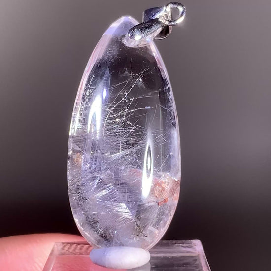 A beautiful polished teardrop pendant of clear quartz from Brazil featuring rare silver brookite rutile and tiny manifestation crystals. Its shimmering rutile blades and crystal-within-crystal formations create striking depth and elegance, making it a standout collector’s piece you can wear.