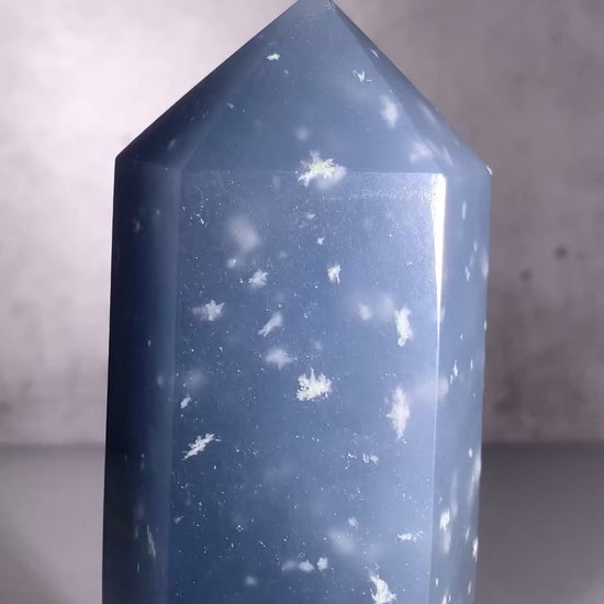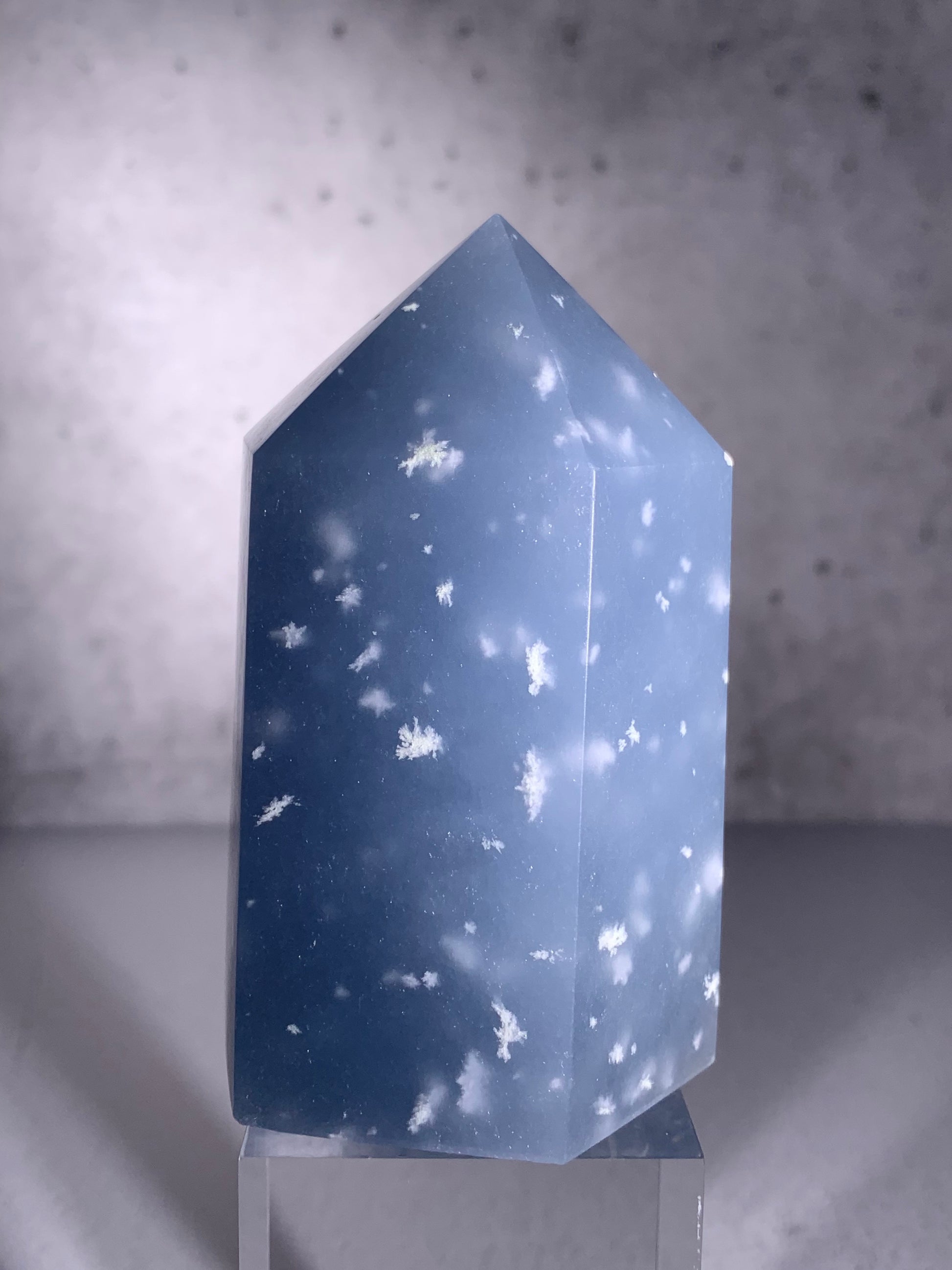 A calming pale blue crystal, adorned with delicate white “snowflake” inclusions. These natural patterns are formed either from remnants of the host rock or from areas where Angelite has partially rehydrated into white gypsum or selenite. Known for its peaceful, angelic energy and gentle communication, this stone makes a beautiful companion for any healing or spiritual space.