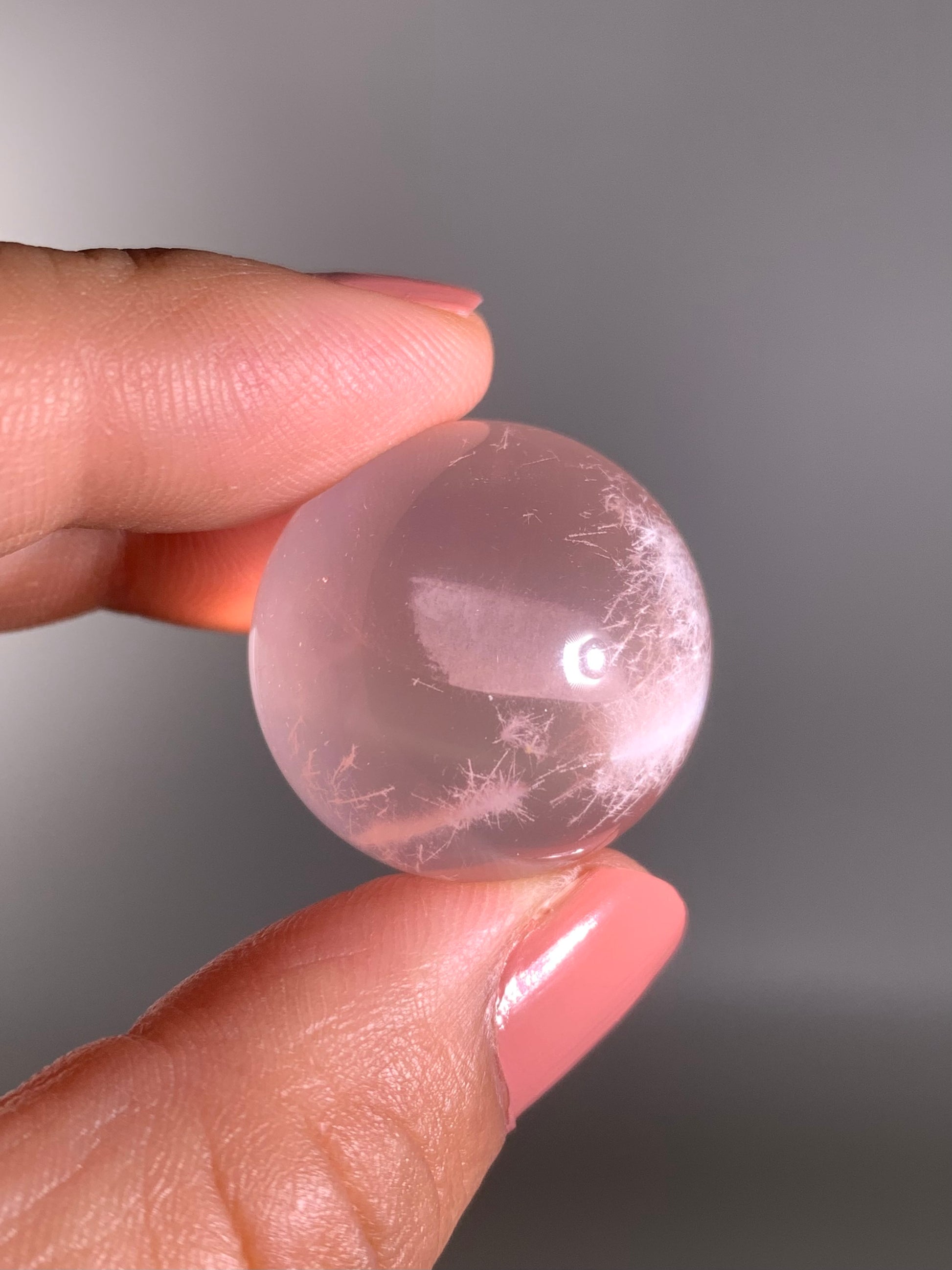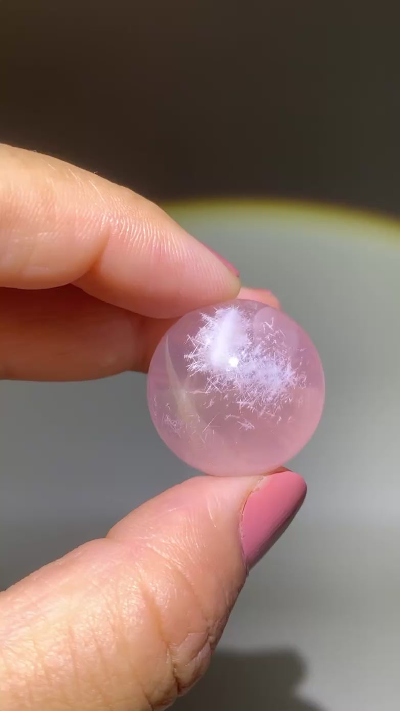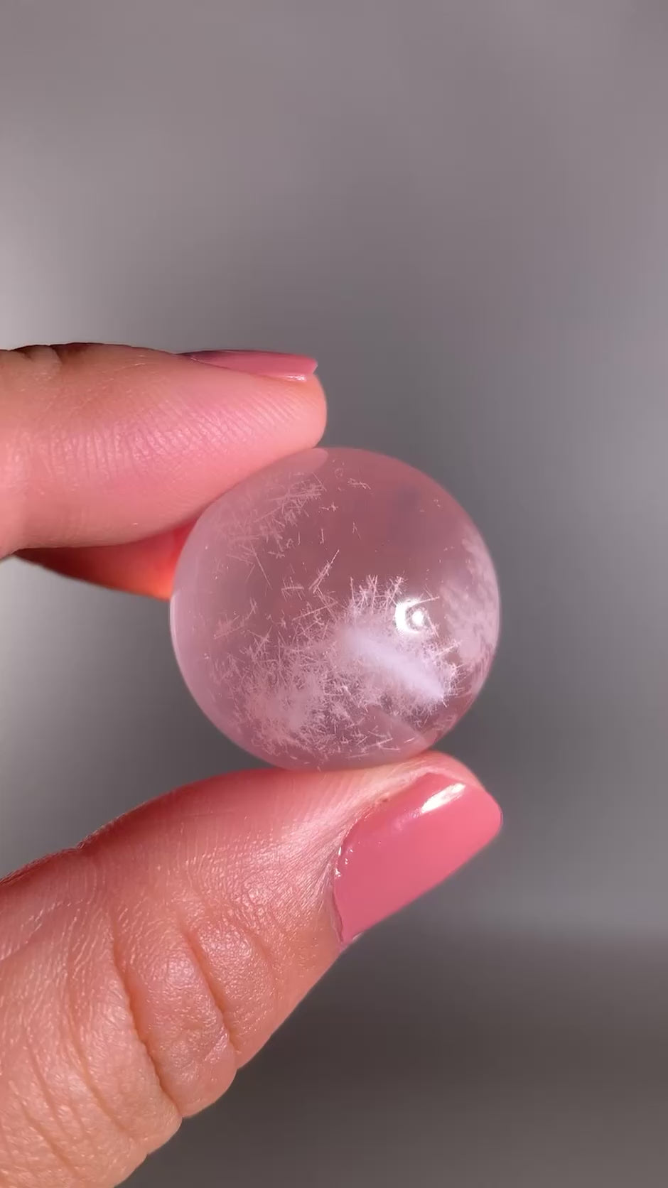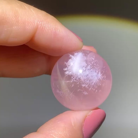 This unique rose quartz sphere features dreamy inner landscapes and natural white inclusions that resemble snowflakes or tiny gardens. It also displays a rare asterism—a star-like light effect visible under direct light. Calming, nurturing, and full of soft, loving energy, each piece is a radiant work of natural art that embodies love, clarity, and inner peace.