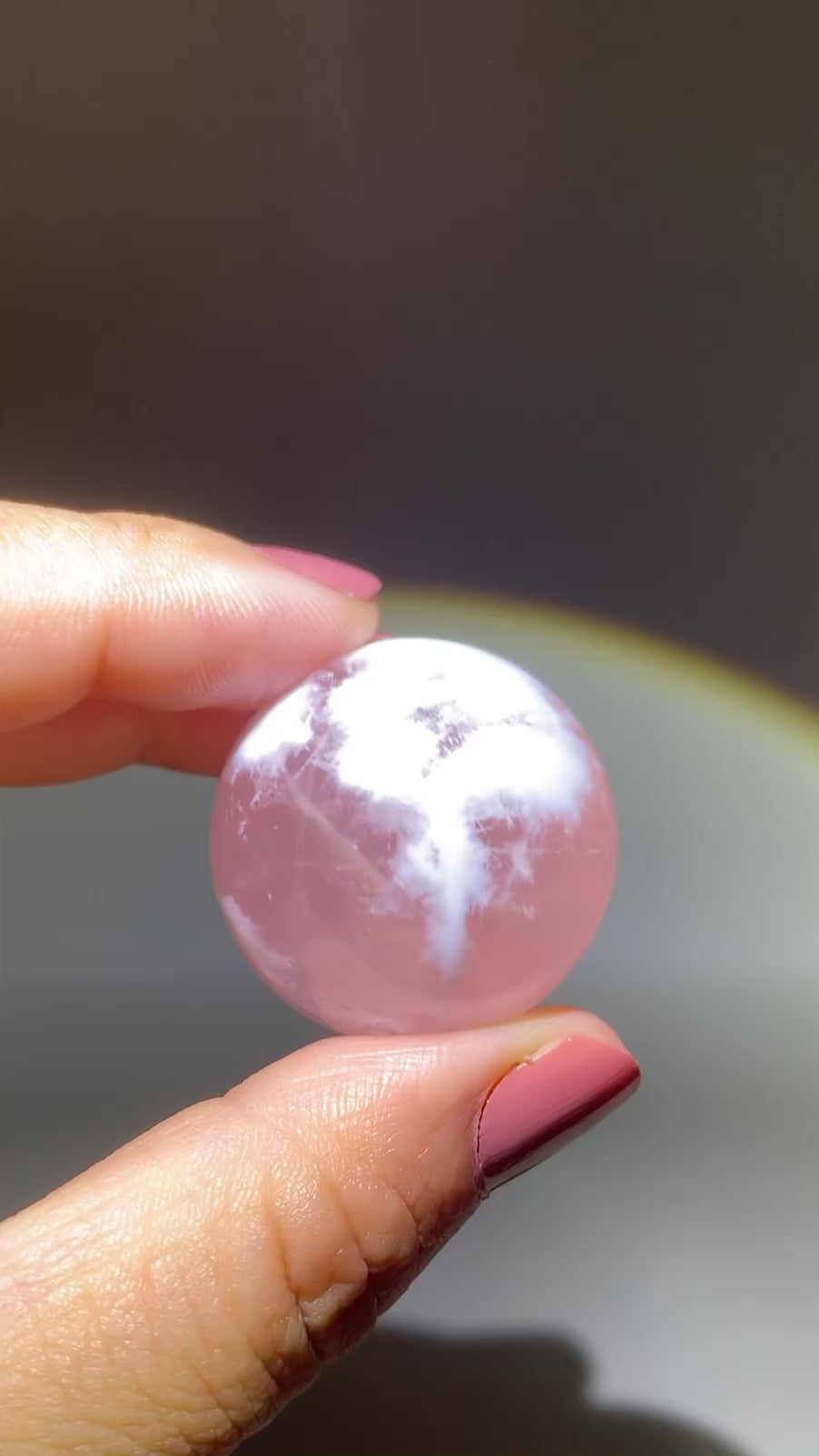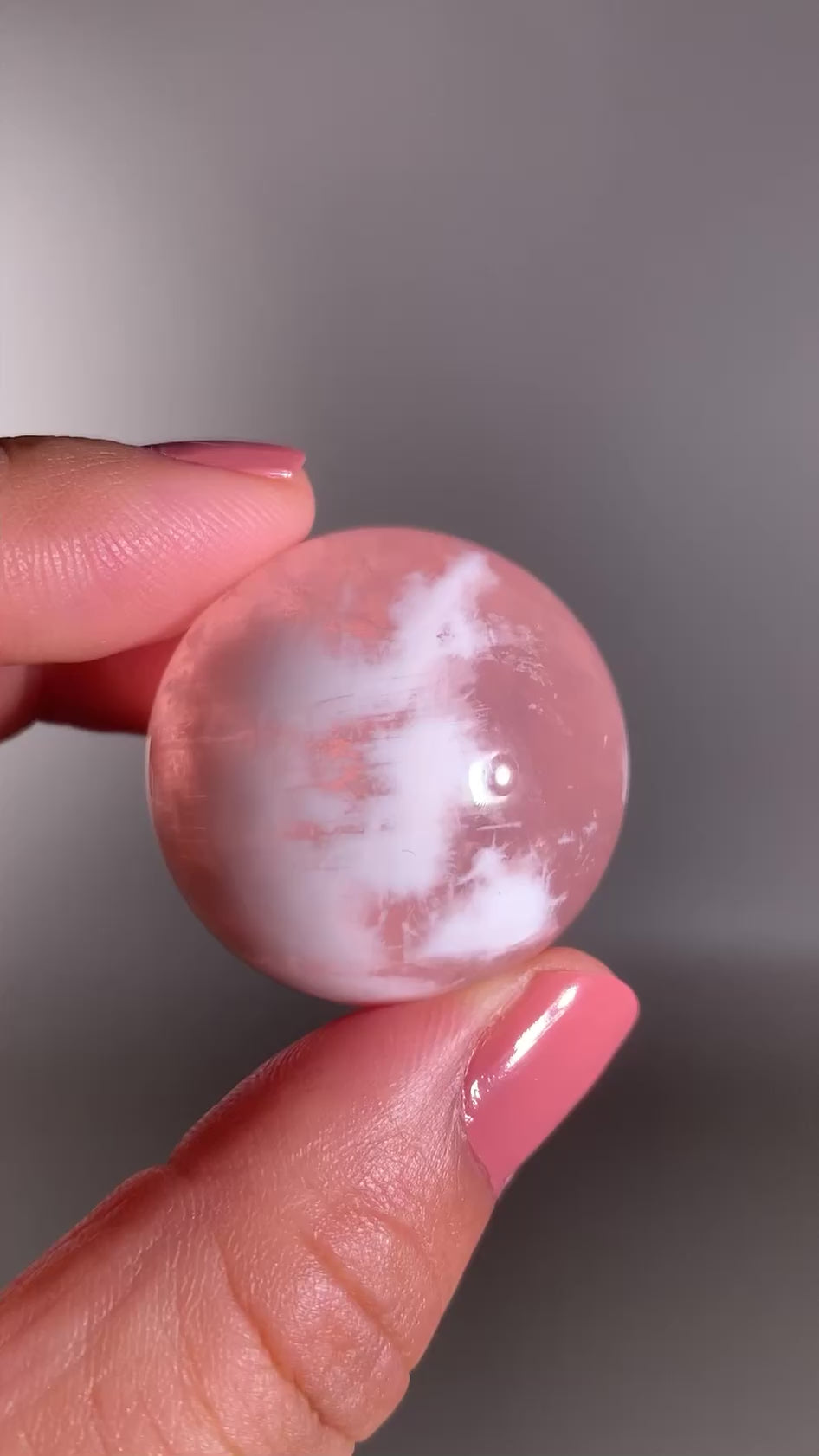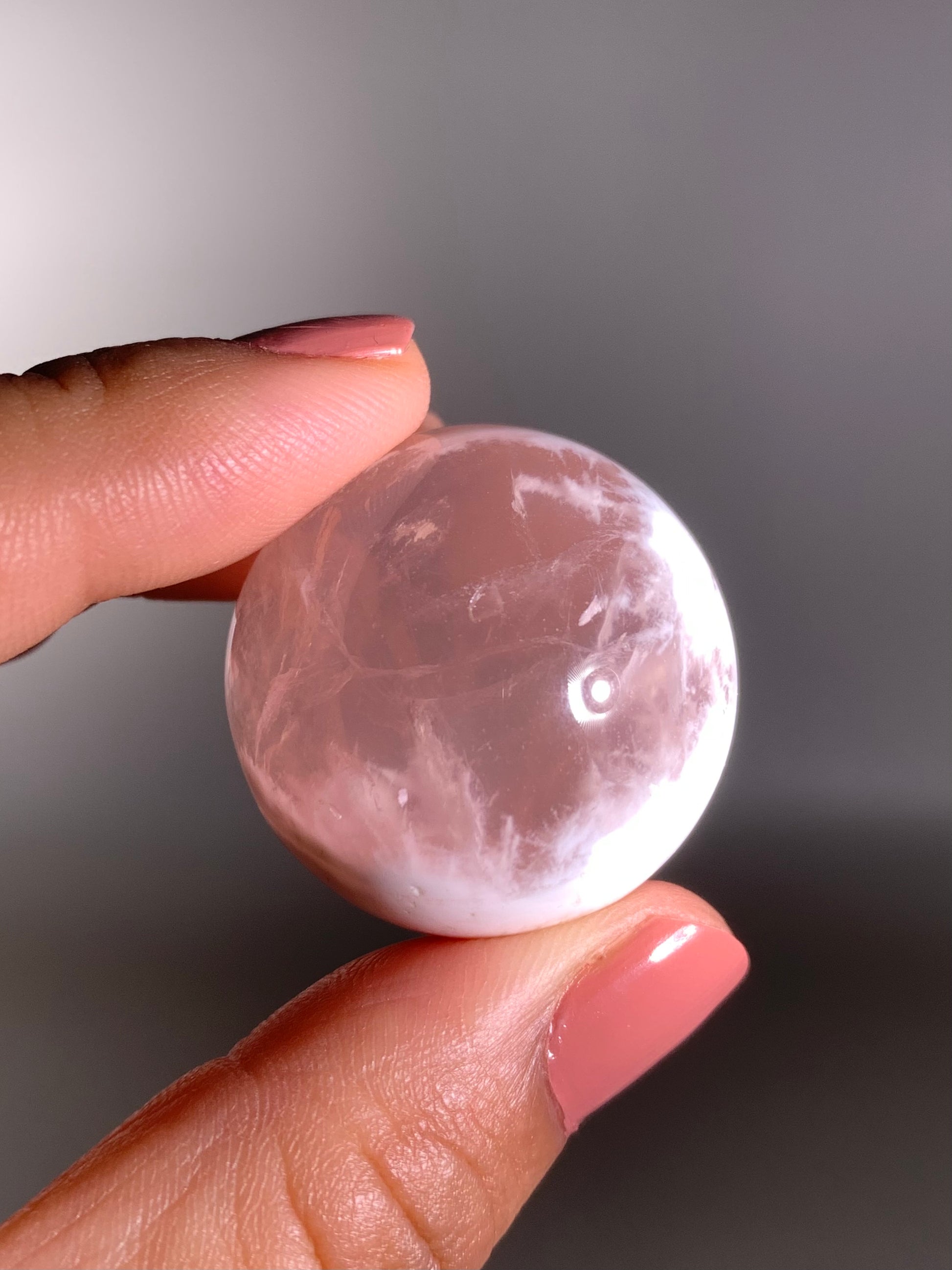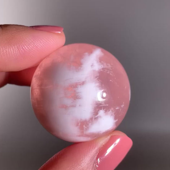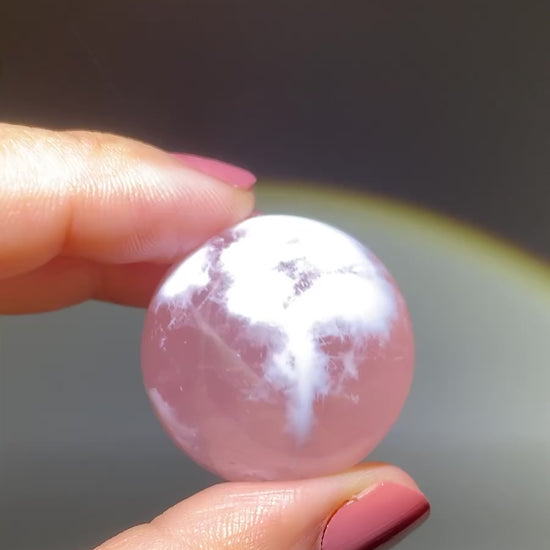 This unique rose quartz sphere features dreamy inner landscapes and natural white inclusions that resemble snowflakes or tiny gardens. It also displays a rare asterism—a star-like light effect visible under direct light. Calming, nurturing, and full of soft, loving energy, each piece is a radiant work of natural art that embodies love, clarity, and inner peace.