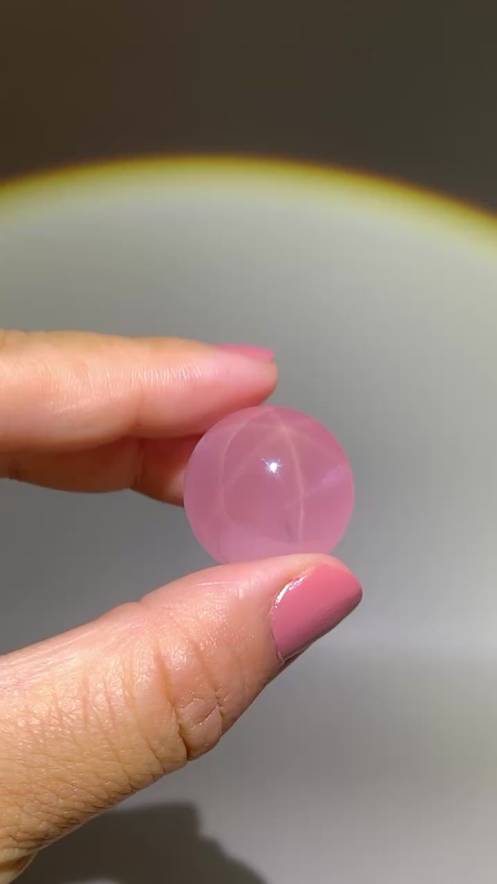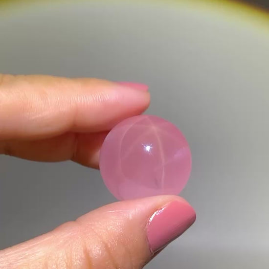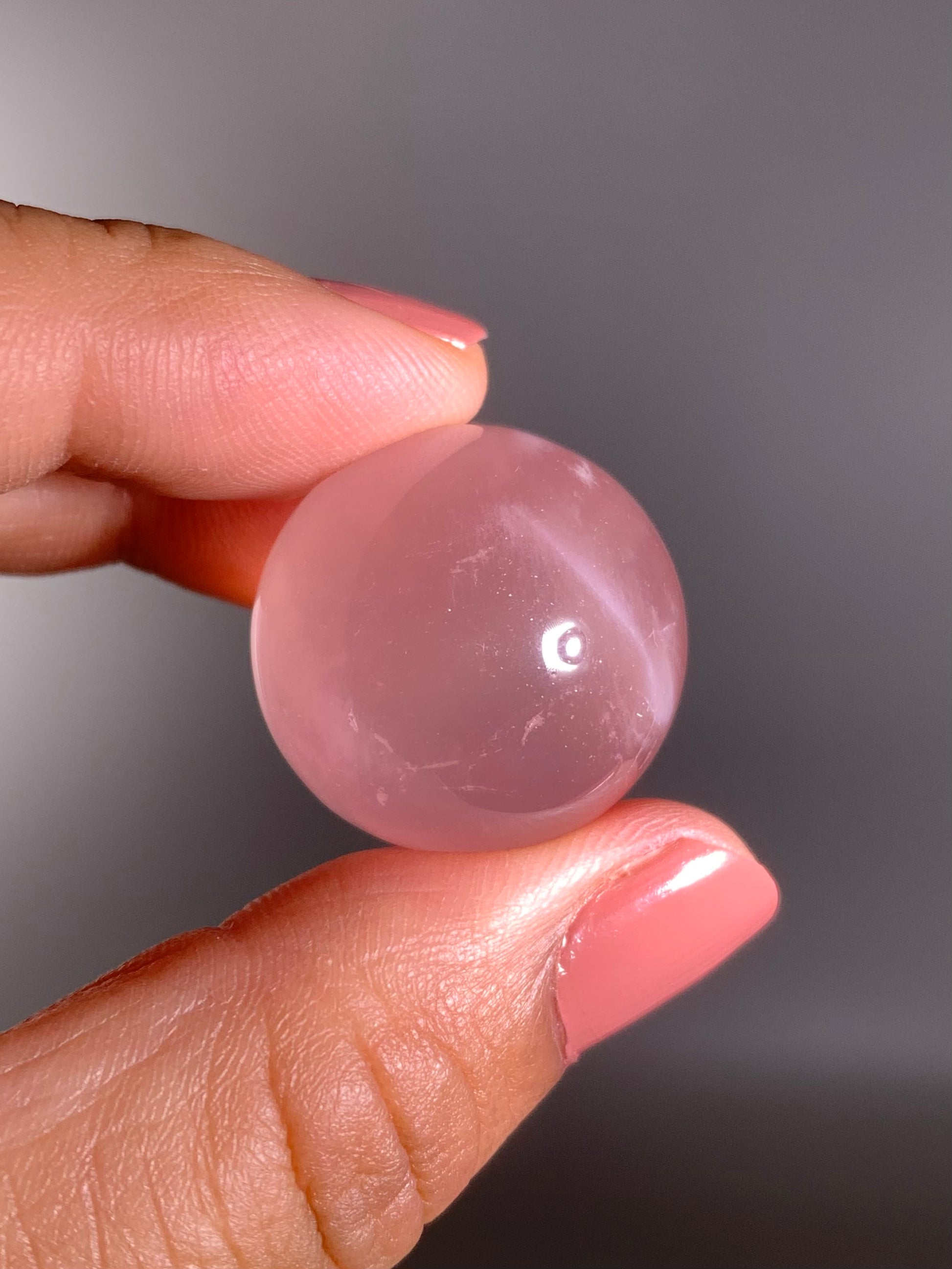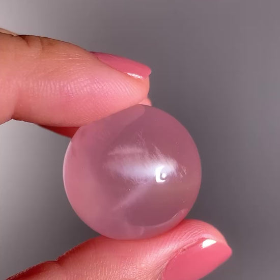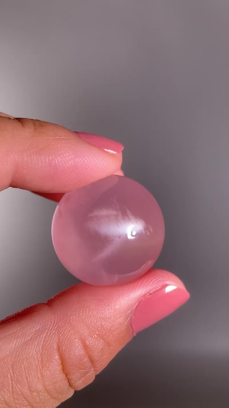 This unique rose quartz sphere features dreamy inner landscapes and natural white inclusions that resemble snowflakes or tiny gardens. It also displays a rare asterism—a star-like light effect visible under direct light. Calming, nurturing, and full of soft, loving energy, each piece is a radiant work of natural art that embodies love, clarity, and inner peace.