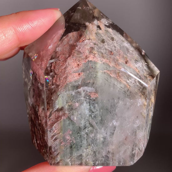 This Statement Piece High-Quality Pink & Grey-Green Garden Quartz Tower from Brazil is a mesmerizing display of natural beauty and balance. Soft pink and earthy grey-green mineral inclusions form a dreamy, garden-like landscape within clear quartz, creating stunning depth and color contrast. Expertly hand-polished to highlight its clarity and vibrant inner world, this tower radiates elegance and grounding energy. A true collector’s piece, it brings together serenity, artistry, and the timeless charm of Brazilian quartz.