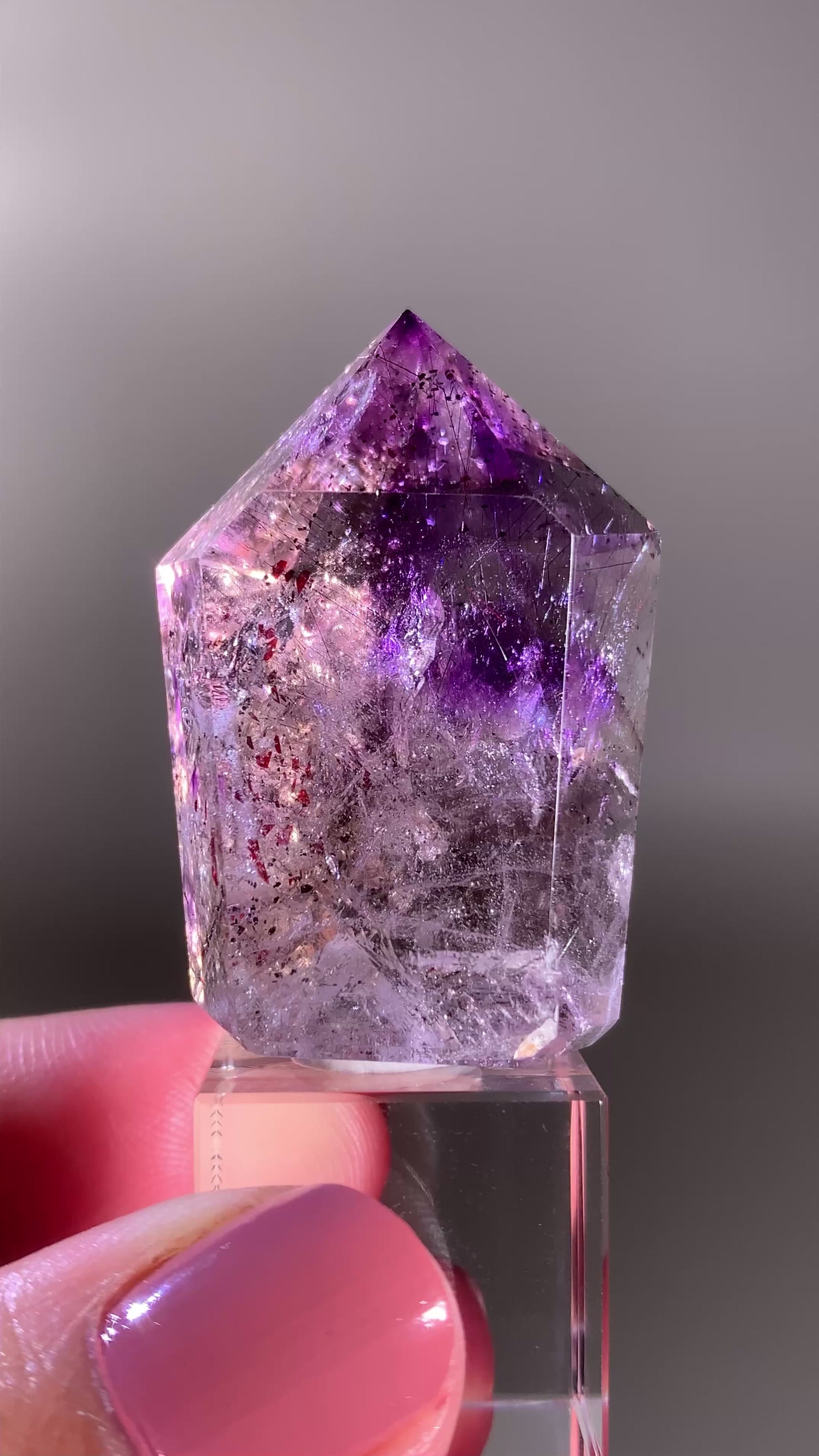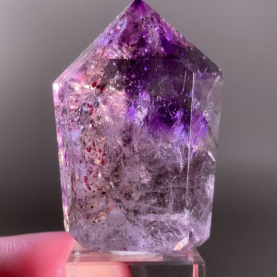 This Super Seven polished tower from Madagascar features the natural combination of amethyst, clear quartz, smoky quartz, cacoxenite, goethite, lepidocrocite, and rutile within a single crystal. The layered inclusions create rich color, depth, and texture, all beautifully revealed by a smooth, glossy polish. This piece is perfect for display and for collectors who appreciate complex, multi-mineral specimens.