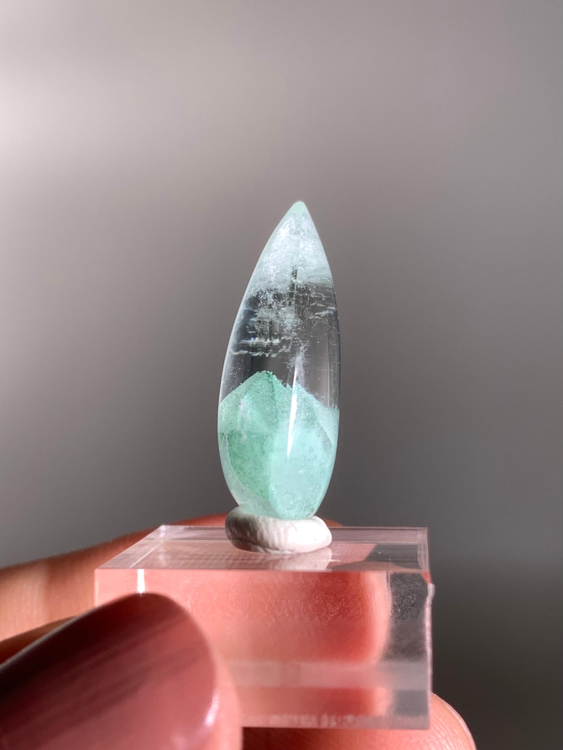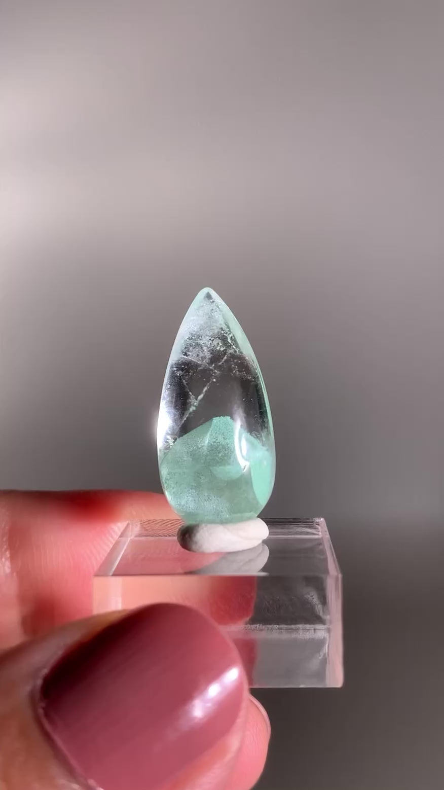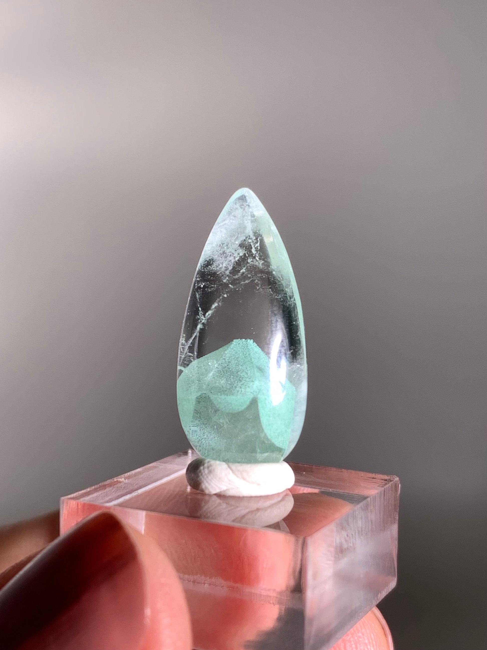 A rare and exquisite crystal, this teardrop-polished phantom quartz from Madagascar features a unique Tiffany Blue hue—a soft, pastel aqua rarely seen in quartz. This exceptionally rare coloration is found only in select deposits from Madagascar. Natural phantom formations within the stone reveal ghost-like layers of earlier crystal growth, creating stunning visual depth. Highly sought after for both its beauty and rarity, this piece is ideal for collectors and crystal enthusiasts alike.