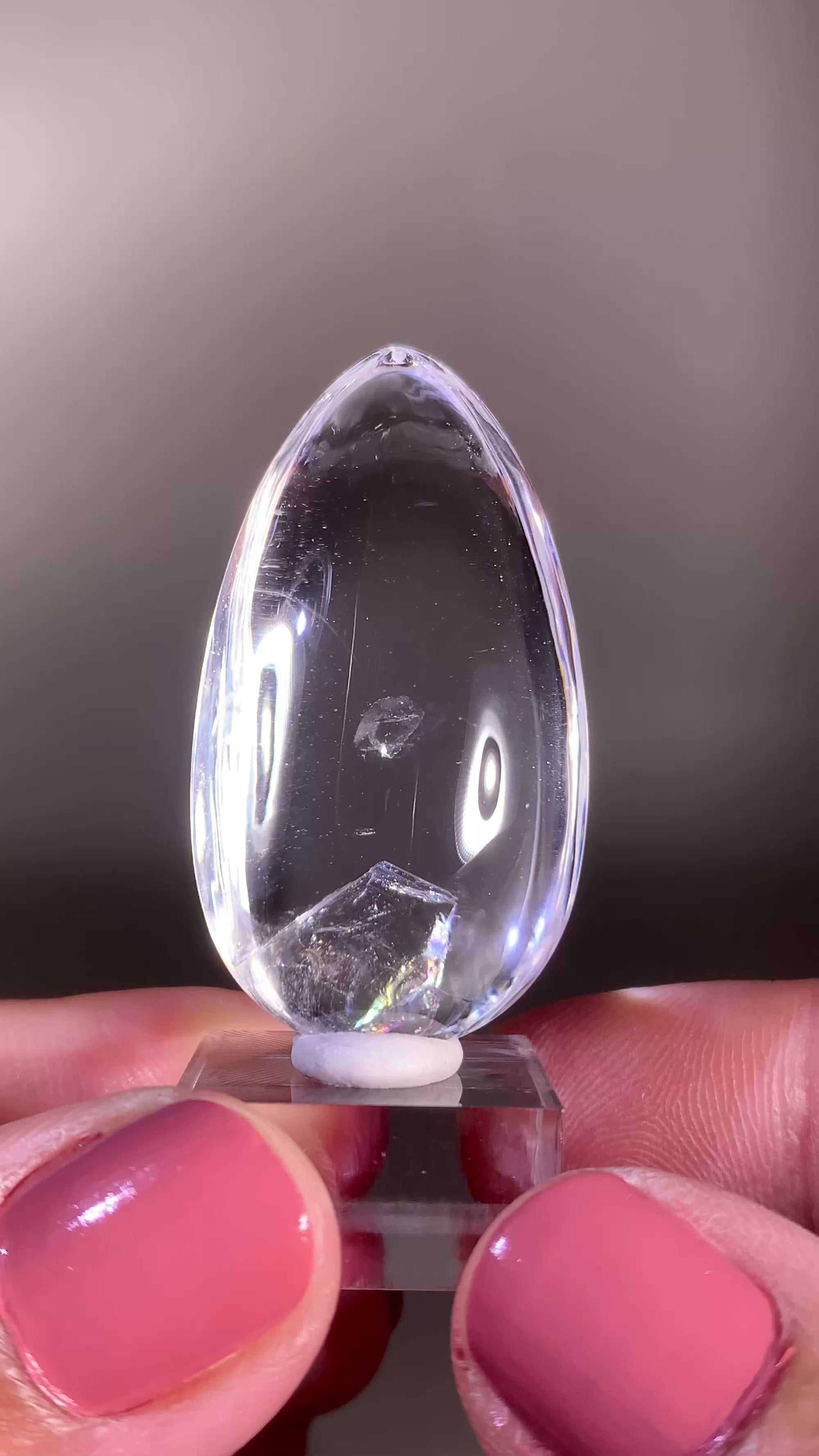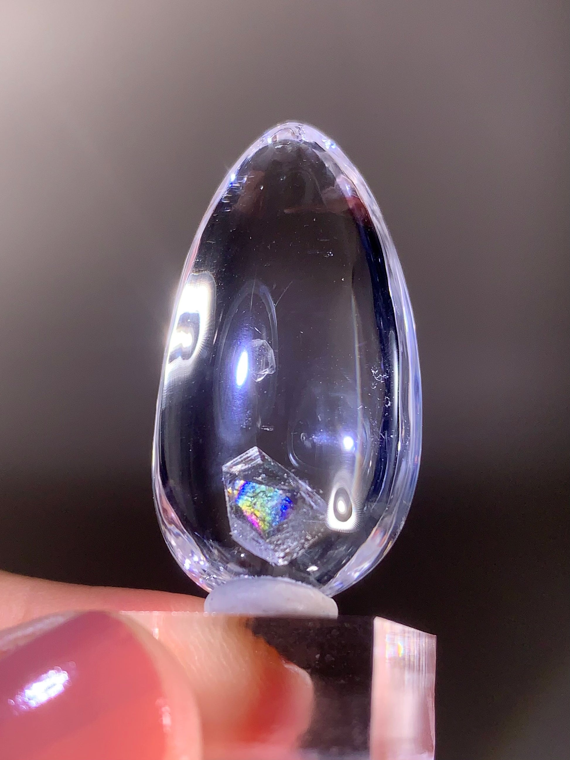 A top-quality water-clear quartz featuring a rare manifestation (crystal within a crystal) and a vibrant internal rainbow. Its clarity, natural beauty, and unique formations make it a stunning collector’s piece.