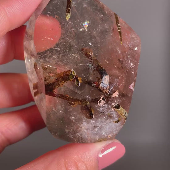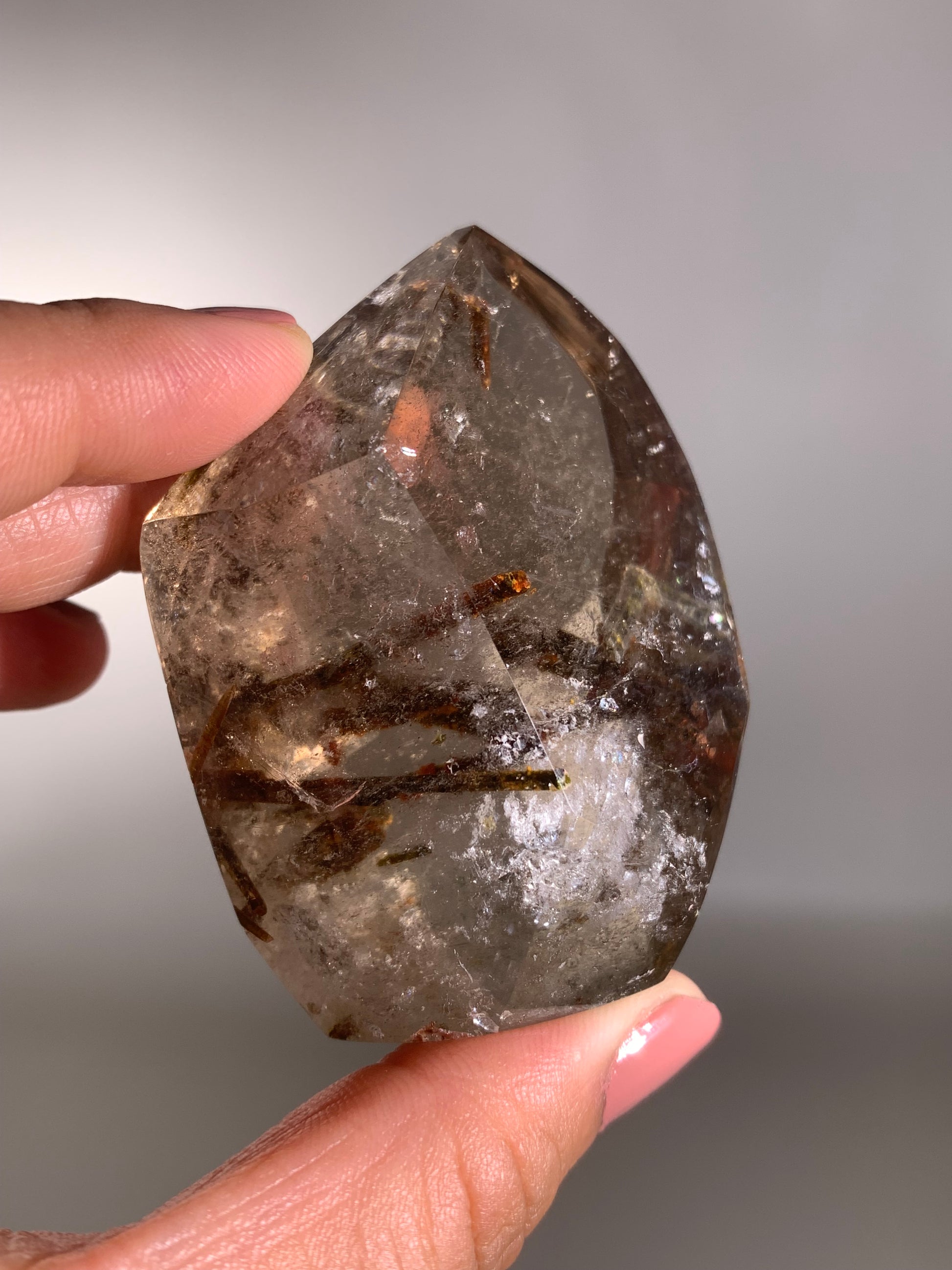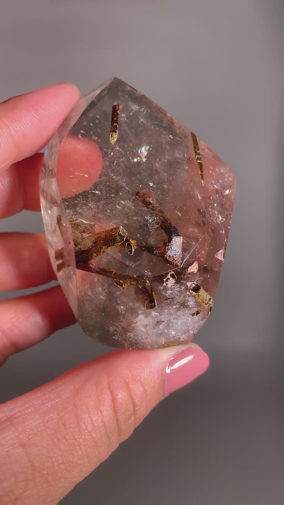 A unique Garden Quartz polished freeform from Brazil, featuring green tourmaline inclusions with subtle red and yellow lodolite — a rare fusion of clarity, texture, and color.