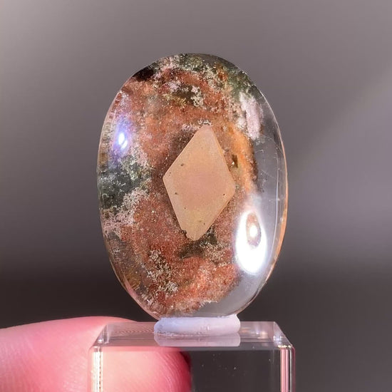 This unique diamond-shaped mica with garden quartz is a polished pocket stone featuring delicate internal inclusions and subtle natural textures. The polished finish highlights the mica’s distinctive shape and the garden quartz’s miniature landscapes, making it a captivating piece to admire up close.