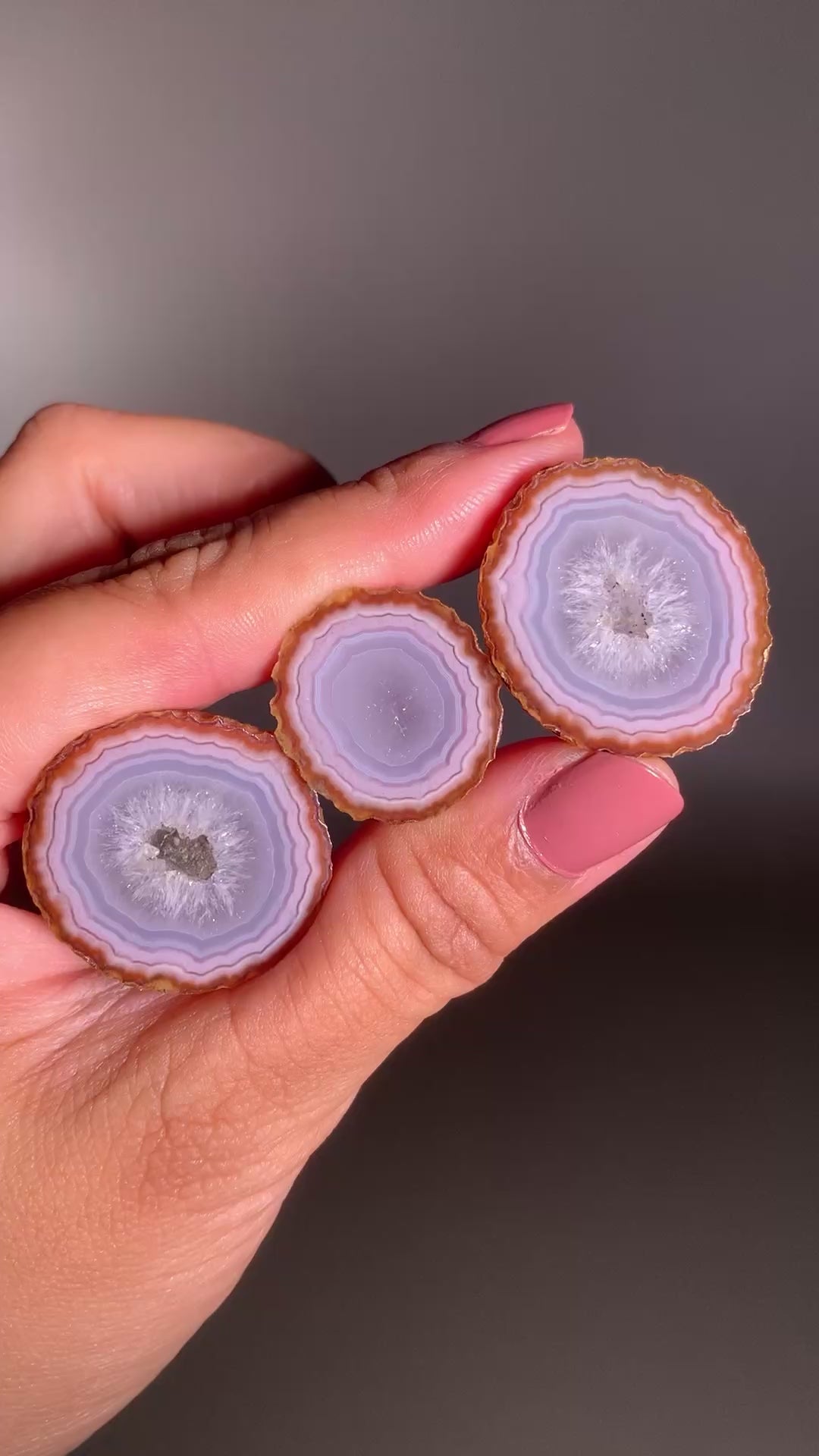 This agate trio was originally one specimen cut in half. However, one half extended too far at the back, making it difficult to place on a stand. To resolve this, the vendor trimmed the longer half, resulting in three pieces in total.